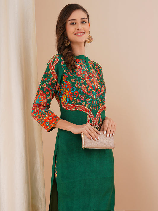 Ethnic Floral Printed & Embroidered Straight Fit...