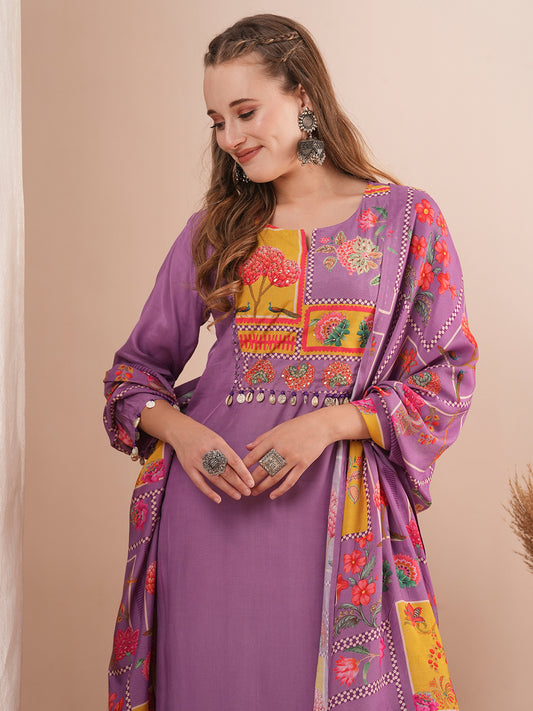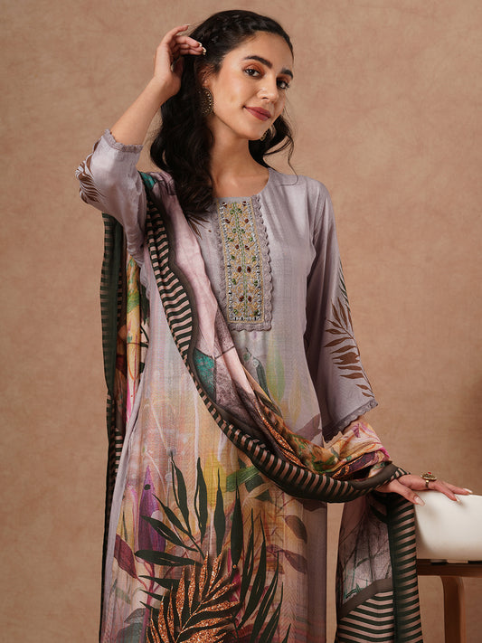 Ethnic Floral Printed & Hand Embroidered Straight...
