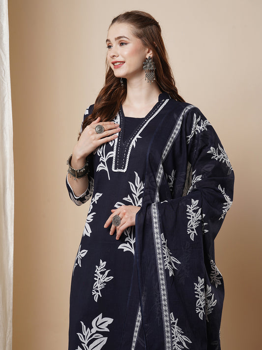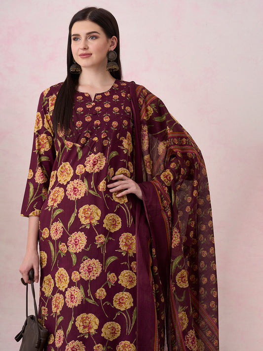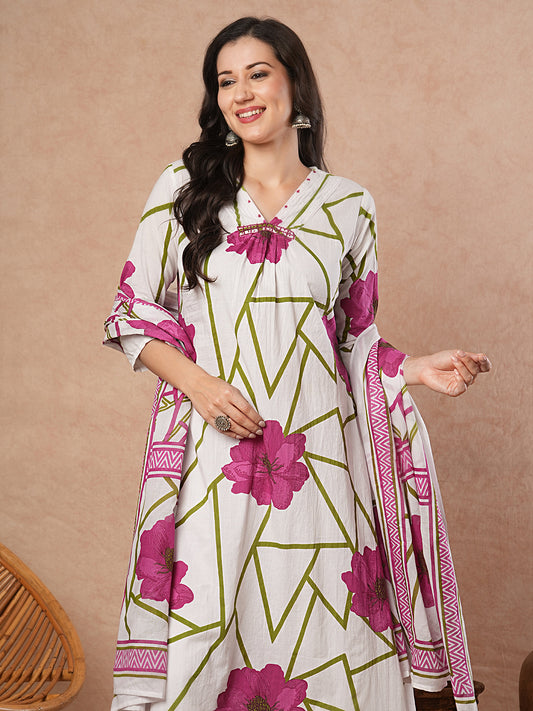 Ethnic Floral Printed & Embroidered A-Line Kurta...