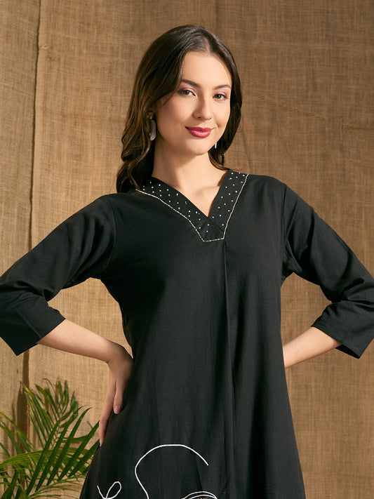 MRP (Inclusive of all taxes)Regular price ₹ 1,499.00₹ 1,499.00 Regular priceUnit price / per₹ 5,399.00Sale priceM L XL 2XL add to cartSale{"id":7591190167638,"title":"Solid Abstract Embroidered A-Line Flared Co-ord Set - Black","handle":"solid-abstract-embroidered-a-line-flared-co-ord-set-black","description":"\u003ch1\u003eHighlights\u003c\/h1\u003e\n\u003cp\u003e\u003cbr\u003e-A striking blend of art and elegance, this co-ord set in breathable cotton flax features a flattering A-line flare and V-neckline. The highlight—an intricately hand-embroidered abstract face in threadwork and bead detailing—adds a bold, modern edge to this rust-toned ensemble.\u003c\/p\u003e\n\u003ch1\u003eFabric \u0026amp; Colour\u003c\/h1\u003e\n\u003cp\u003e\u003cbr\u003eTop Colour: Black\u003cbr\u003eTop Fabric: Cotton\u003cbr\u003eBottom Colour: Black\u003cbr\u003eBottom Fabric: Cotton Blend\u003c\/p\u003e\n\u003ch1\u003eSpecifications\u003c\/h1\u003e\n\u003cp\u003e\u003cbr\u003eTop Design: Solid\u003cbr\u003eTop Craft: Embroidery, Plain and Prints\u003cbr\u003eTop Shape: A-line\u003cbr\u003eNeck: V-Neck\u003cbr\u003eSleeve Length: Three-Quarter Sleeves\u003cbr\u003eTop Length: Calf Length\u003cbr\u003eHemline: Flared\u003cbr\u003eSlit: Side Slits\u003c\/p\u003e\n\u003cp\u003eBottom Type: Trousers\u003cbr\u003eBottom Closure: Slip-On\u003cbr\u003eWaistband: Partially Elasticated\u003c\/p\u003e\n\u003cp\u003eWash Care: Hand Wash\u003c\/p\u003e\n\u003cp\u003eLength (in inches)\u003cbr\u003eKurta – 46, Sleeves – 17,\u003cbr\u003eBottom - 38\u003c\/p\u003e\n\u003cp\u003eModel’s Height: 5’7”. Wearing Size S.\u003c\/p\u003e\n\u003ch1\u003eProduct Information\u003c\/h1\u003e\n\u003cp\u003e\u003cbr\u003eManufactured\/Packed\/Marketed By:\u003cbr\u003eFashor Lifestyle Pvt. Ltd.\u003cbr\u003e28\/30, Sudarshanpura Industrial Area,\u003cbr\u003eJaipur - 302006.\u003cbr\u003eCountry of Origin: India\u003c\/p\u003e","published_at":"2025-07-18T07:29:29+05:30","created_at":"2025-07-17T18:34:01+05:30","vendor":"FASHOR","type":"2P Kurta Set","tags":["1001-2000","2001-3000","31439","All Styles","casualwear","co-ord","colour_black","craft_embroidery","craft_plain-and-prints","design_solid","discount-zone","fabric_cotton","KURTI","kurtis","L","meta-size-chart-","now-trending","offer-zone","shape_a-line","workwear"],"price":149900,"price_min":149900,"price_max":149900,"available":true,"price_varies":false,"compare_at_price":539900,"compare_at_price_min":539900,"compare_at_price_max":539900,"compare_at_price_varies":false,"variants":[{"id":42480209854550,"title":"M","option1":"M","option2":null,"option3":null,"sku":"38-KBB31439F5FS","requires_shipping":true,"taxable":false,"featured_image":{"id":34687791726678,"product_id":7591190167638,"position":5,"created_at":"2025-07-17T18:34:41+05:30","updated_at":"2025-07-17T18:35:54+05:30","alt":null,"width":1080,"height":1440,"src":"\/\/fashor.com\/cdn\/shop\/files\/31539_7.jpg?v=1752757554","variant_ids":[42480209854550,42480209887318,42480209920086,42480209952854]},"available":false,"name":"Solid Abstract Embroidered A-Line Flared Co-ord Set - Black - M","public_title":"M","options":["M"],"price":149900,"weight":0,"compare_at_price":539900,"inventory_quantity":0,"inventory_management":"shopify","inventory_policy":"deny","barcode":"","featured_media":{"alt":null,"id":26951394558038,"position":5,"preview_image":{"aspect_ratio":0.75,"height":1440,"width":1080,"src":"\/\/fashor.com\/cdn\/shop\/files\/31539_7.jpg?v=1752757554"}},"requires_selling_plan":false,"selling_plan_allocations":[],"quantity_rule":{"min":1,"max":null,"increment":1}},{"id":42480209887318,"title":"L","option1":"L","option2":null,"option3":null,"sku":"40-KBB31439F5FS","requires_shipping":true,"taxable":false,"featured_image":{"id":34687791726678,"product_id":7591190167638,"position":5,"created_at":"2025-07-17T18:34:41+05:30","updated_at":"2025-07-17T18:35:54+05:30","alt":null,"width":1080,"height":1440,"src":"\/\/fashor.com\/cdn\/shop\/files\/31539_7.jpg?v=1752757554","variant_ids":[42480209854550,42480209887318,42480209920086,42480209952854]},"available":true,"name":"Solid Abstract Embroidered A-Line Flared Co-ord Set - Black - L","public_title":"L","options":["L"],"price":149900,"weight":0,"compare_at_price":539900,"inventory_quantity":1,"inventory_management":"shopify","inventory_policy":"deny","barcode":"","featured_media":{"alt":null,"id":26951394558038,"position":5,"preview_image":{"aspect_ratio":0.75,"height":1440,"width":1080,"src":"\/\/fashor.com\/cdn\/shop\/files\/31539_7.jpg?v=1752757554"}},"requires_selling_plan":false,"selling_plan_allocations":[],"quantity_rule":{"min":1,"max":null,"increment":1}},{"id":42480209920086,"title":"XL","option1":"XL","option2":null,"option3":null,"sku":"42-KBB31439F5FS","requires_shipping":true,"taxable":false,"featured_image":{"id":34687791726678,"product_id":7591190167638,"position":5,"created_at":"2025-07-17T18:34:41+05:30","updated_at":"2025-07-17T18:35:54+05:30","alt":null,"width":1080,"height":1440,"src":"\/\/fashor.com\/cdn\/shop\/files\/31539_7.jpg?v=1752757554","variant_ids":[42480209854550,42480209887318,42480209920086,42480209952854]},"available":false,"name":"Solid Abstract Embroidered A-Line Flared Co-ord Set - Black - XL","public_title":"XL","options":["XL"],"price":149900,"weight":0,"compare_at_price":539900,"inventory_quantity":0,"inventory_management":"shopify","inventory_policy":"deny","barcode":"","featured_media":{"alt":null,"id":26951394558038,"position":5,"preview_image":{"aspect_ratio":0.75,"height":1440,"width":1080,"src":"\/\/fashor.com\/cdn\/shop\/files\/31539_7.jpg?v=1752757554"}},"requires_selling_plan":false,"selling_plan_allocations":[],"quantity_rule":{"min":1,"max":null,"increment":1}},{"id":42480209952854,"title":"2XL","option1":"2XL","option2":null,"option3":null,"sku":"44-KBB31439F5FS","requires_shipping":true,"taxable":false,"featured_image":{"id":34687791726678,"product_id":7591190167638,"position":5,"created_at":"2025-07-17