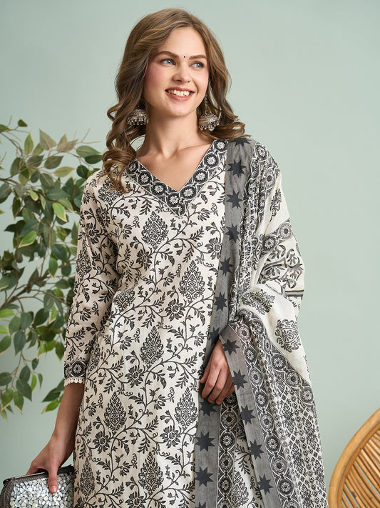 Ethnic Floral Printed & Embroidered Straight Fit...
