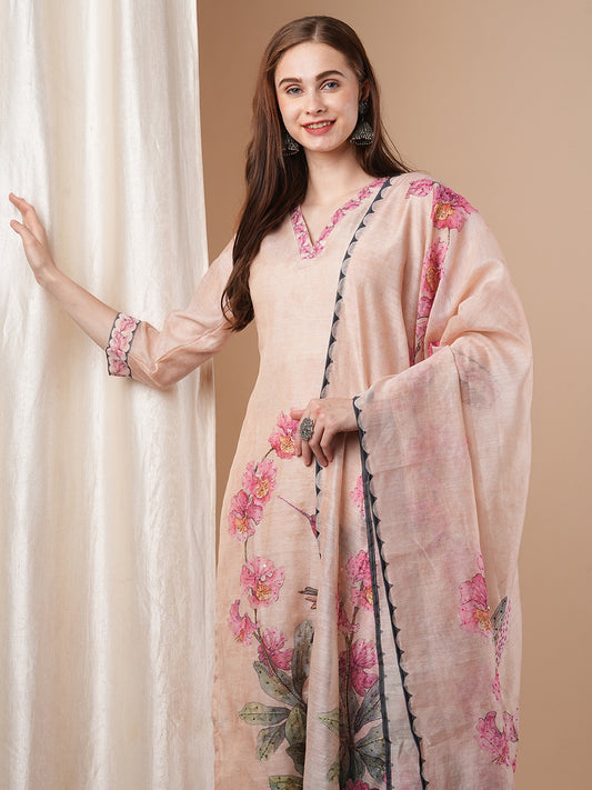 Abstract Floral Printed & Schiffli Embroidered Straight...