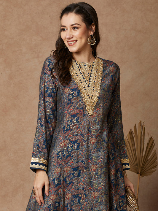 Floral Printed Cutdana Embroidered Flared Kurta With...