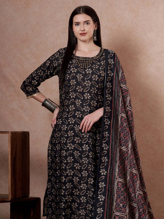 Ethnic Floral Printed & Embroidered A-Line Pleated...