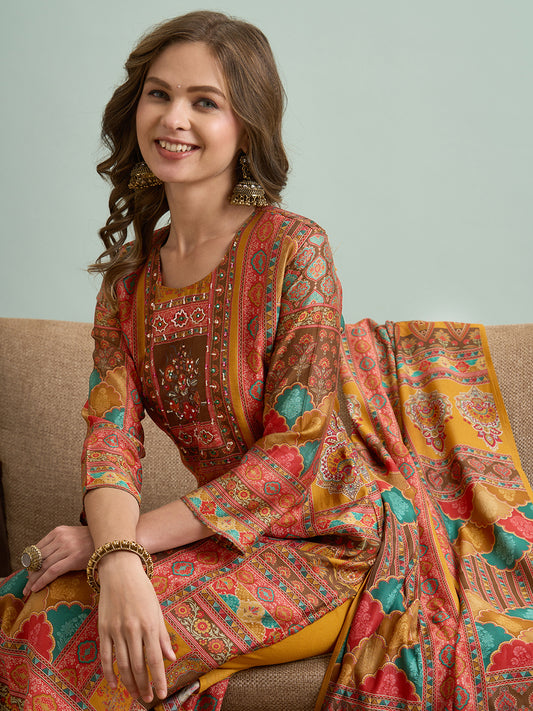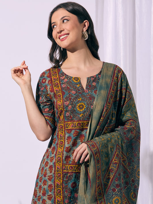 Ethnic Floral Printed & Embroidered Straight Fit...
