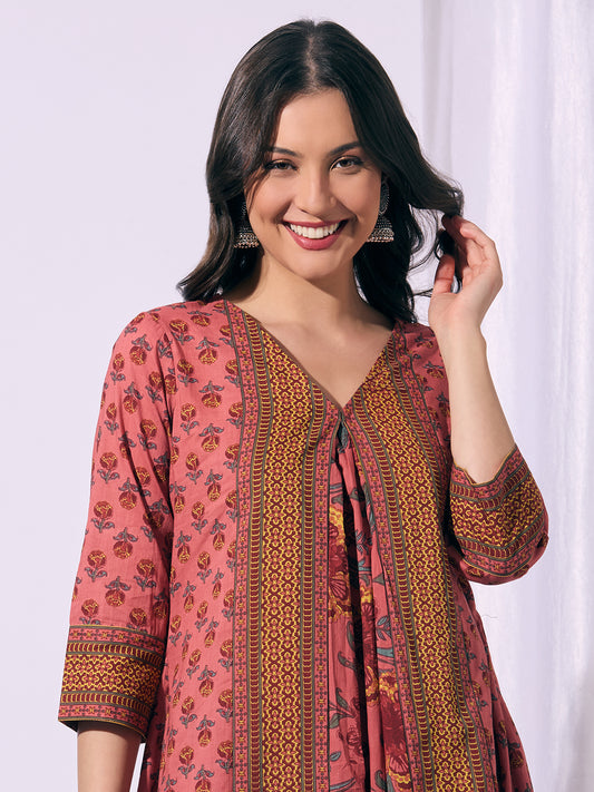 Ethnic Floral Printed A-Line Pleated Kurta with...