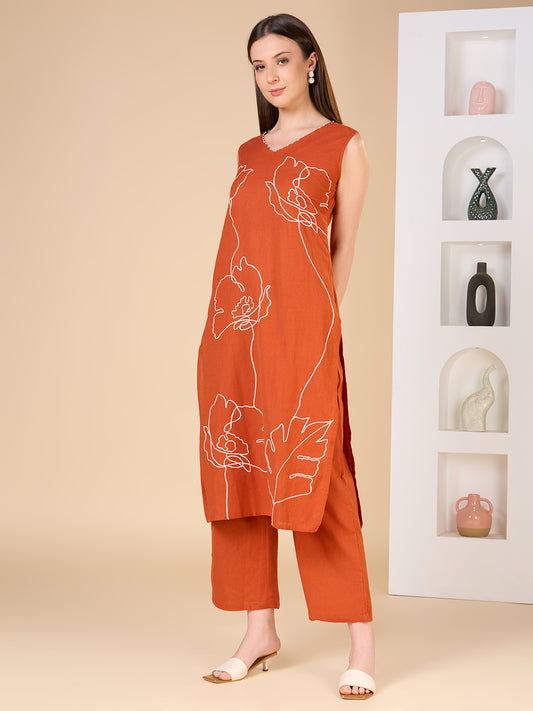 Solid Floral Threadwork Embroidered Straight Fit Co-ord...