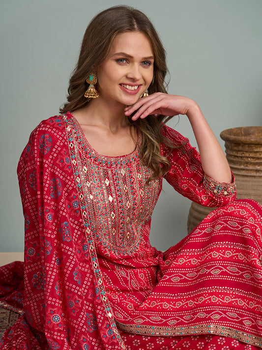 Bandhani Printed & Embroidered Straight Fit Kurta...