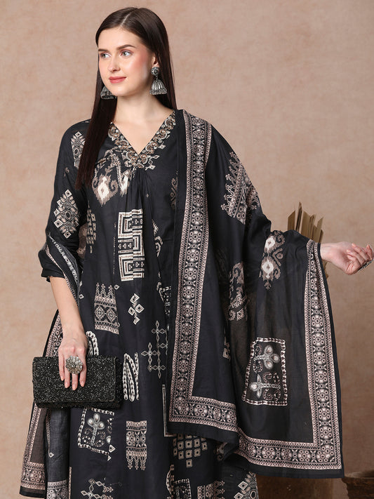 Tribal Ethnic Printed & Dori Embroidered A-Line...