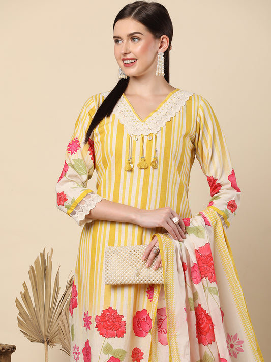 Floral & Stripes Printed Straight Cotton Flax...