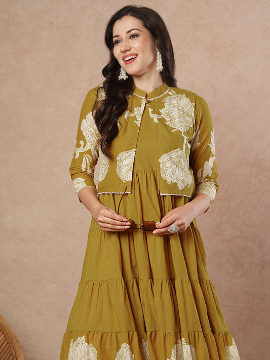 Ethnic Floral Printed & Embroidered A-Line Paneled...
