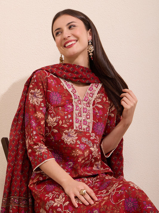 Ethnic Floral Printed & Embroidered Straight Fit...