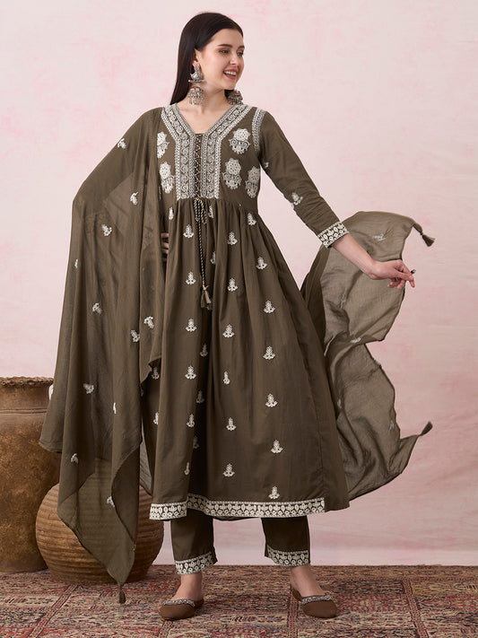 Ethnic Floral Printed Embroidered Anarkali Flared Kurta...