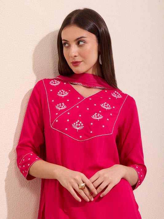 Solid Floral Embroidered A-Line Kurta with Pant...