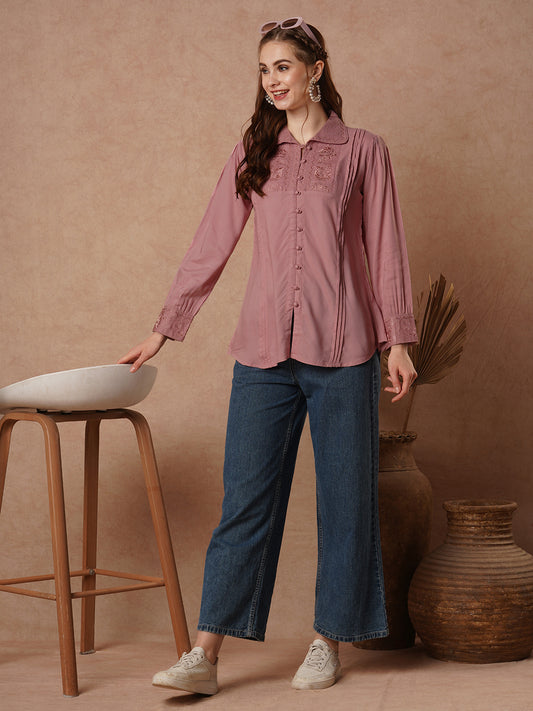 Pink Floral Threadwork Embroidered Straight Fit Pleated...