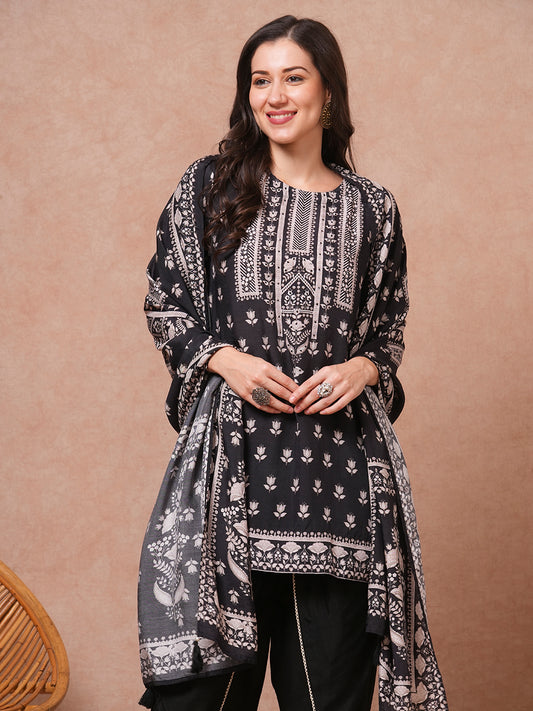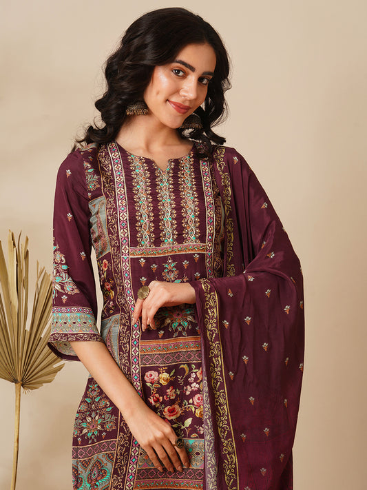 Ethnic Floral Printed & Embroidered Straight Fit...