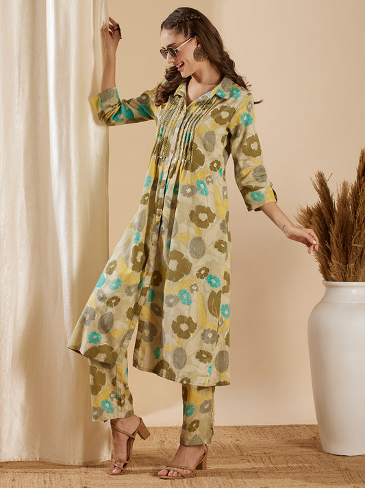 Ethnic Floral Printed & Embroidered Straight Fit...