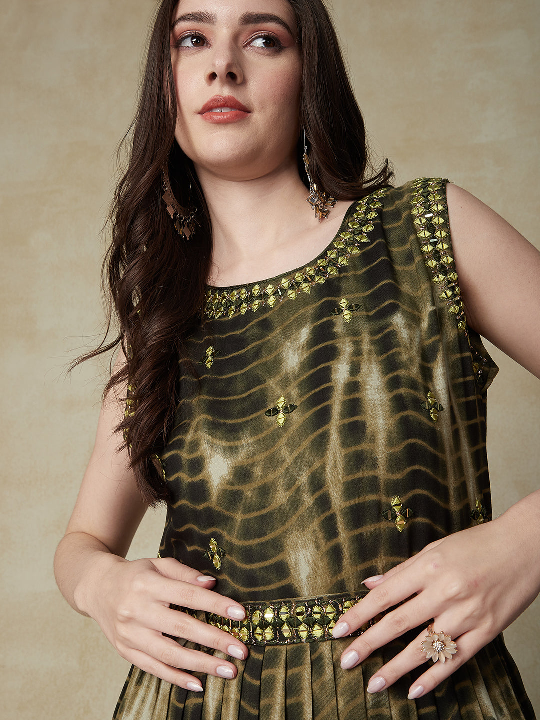 Abstract Printed Mirror & Resham Embroidered Gathered...