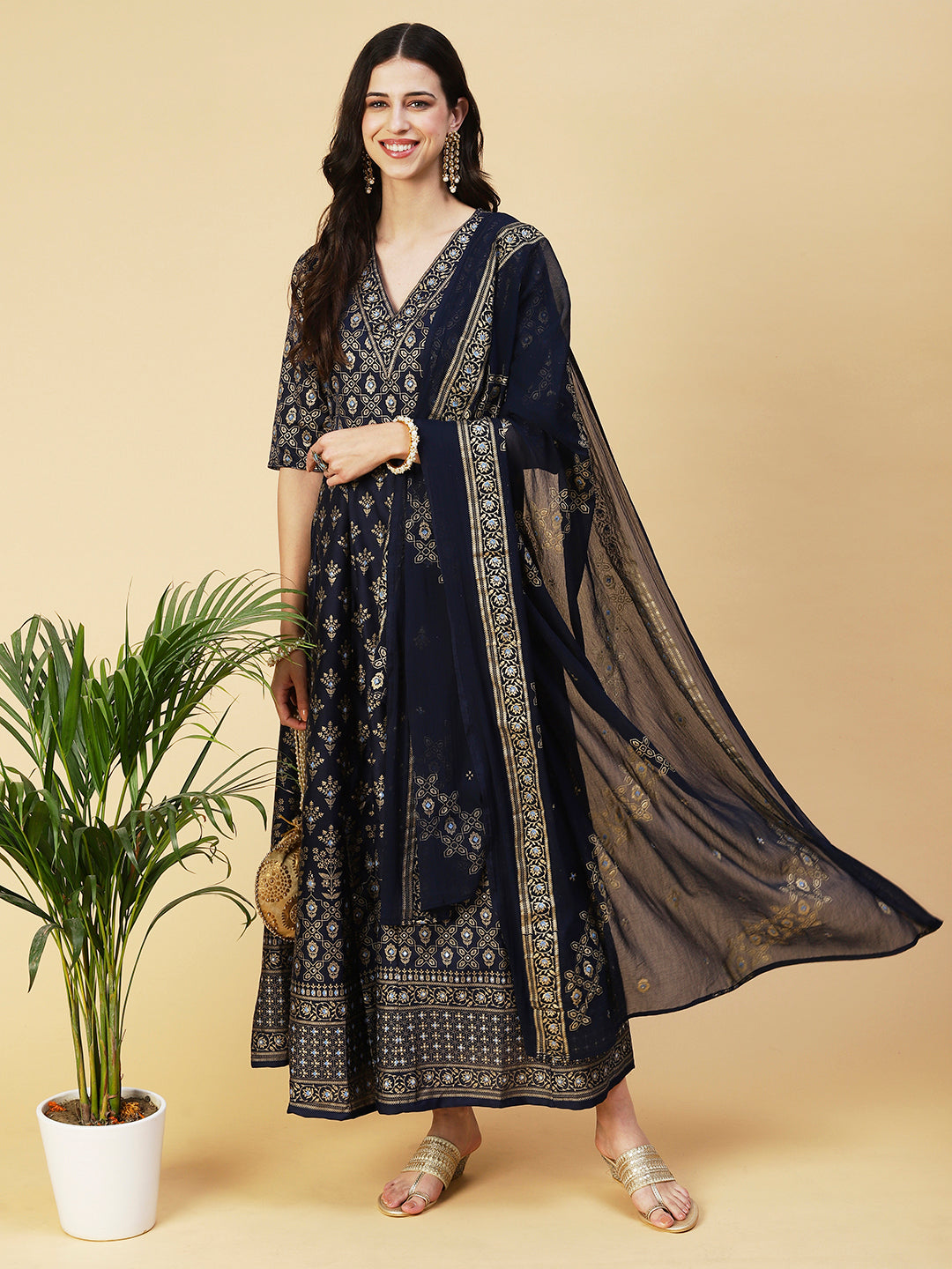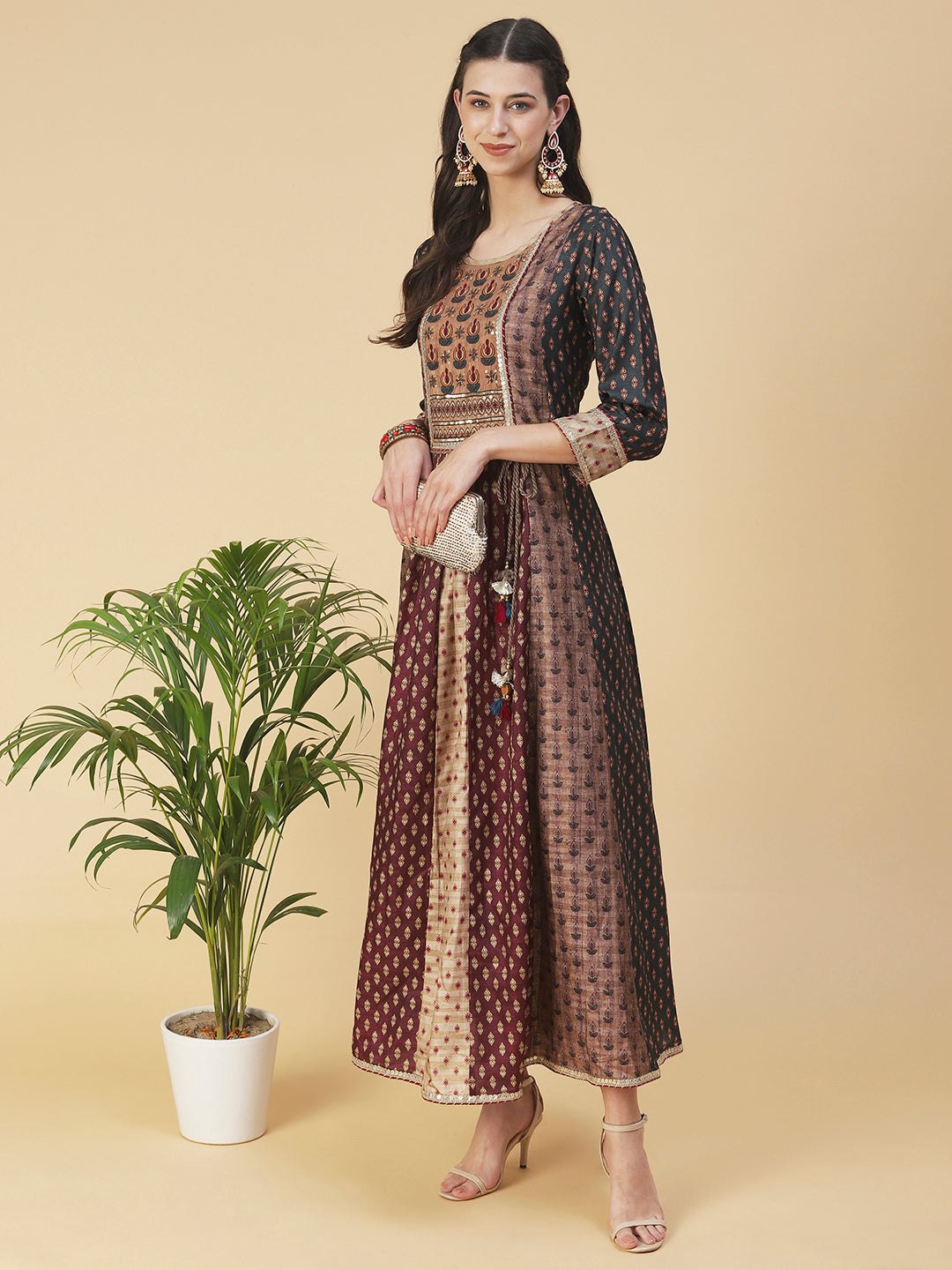 Ethnic Printed & Embroidered Anarkali Flared Midi...