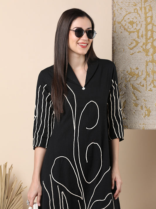 MRP (Inclusive of all taxes)Regular price ₹ 1,599.00₹ 1,599.00 Regular priceUnit price / per₹ 1,599.00Sale priceM L XL 2XL add to cart{"id":7539803226198,"title":"Solid Abstract Floral Embroidered A-Line Flared Midi Dress - Black","handle":"solid-abstract-floral-embroidered-a-line-flared-midi-dress-black","description":"\u003ch1\u003eHighlights\u003c\/h1\u003e\n\u003cp\u003e\u003cbr\u003e-This a-line flared midi dress with abstract floral cord work , features a shawl collar is an ideal fit for everyday wear.\u003c\/p\u003e\n\u003ch1\u003eFabric \u0026amp; Colour\u003c\/h1\u003e\n\u003cp\u003e\u003cbr\u003eColour: Black\u003cbr\u003eFabric: Cotton\u003c\/p\u003e\n\u003ch1\u003eSpecifications\u003c\/h1\u003e\n\u003cp\u003e\u003cbr\u003eDesign: Solid\u003cbr\u003eCraft: Embroidery, Plain and Prints\u003cbr\u003eShape: A-line\u003cbr\u003eNeck: Shirt Collar\u003cbr\u003eSleeve Length: Three-Quarter Sleeves\u003cbr\u003eTop Length: Midi\u003cbr\u003eHemline: Flared\u003cbr\u003e\u003c\/p\u003e\n\u003cp\u003eWash Care: Hand Wash\u003c\/p\u003e\n\u003cp\u003eLength (in inches)\u003cbr\u003eDress – 46, Sleeves – 16\u003c\/p\u003e\n\u003cp\u003eModel’s Height: 5’7”. Wearing Size S.\u003c\/p\u003e\n\u003ch1\u003eProduct Information\u003c\/h1\u003e\n\u003cp\u003e\u003cbr\u003eManufactured\/Packed\/Marketed By:\u003cbr\u003eFashor Lifestyle Pvt. Ltd.\u003cbr\u003e28\/30, Sudarshanpura Industrial Area,\u003cbr\u003eJaipur - 302006.\u003cbr\u003eCountry of Origin: India\u003c\/p\u003e","published_at":"2025-11-11T10:46:45+05:30","created_at":"2025-04-12T11:33:02+05:30","vendor":"FASHOR","type":"Dresses","tags":["1001-2000","30008","All Styles","bs","casualwear","colour_black","craft_embroidery","craft_plain-and-prints","design_solid","fabric_cotton","KURTI","kurtis","M","meta-size-chart-","monsoo","now-trending","shape_a-line"],"price":159900,"price_min":159900,"price_max":159900,"available":true,"price_varies":false,"compare_at_price":159900,"compare_at_price_min":159900,"compare_at_price_max":159900,"compare_at_price_varies":false,"variants":[{"id":42245386567766,"title":"M","option1":"M","option2":null,"option3":null,"sku":"38-DR030008B5OS","requires_shipping":true,"taxable":false,"featured_image":{"id":34270978146390,"product_id":7539803226198,"position":3,"created_at":"2025-04-12T11:33:40+05:30","updated_at":"2025-04-12T11:34:18+05:30","alt":null,"width":1080,"height":1440,"src":"\/\/fashor.com\/cdn\/shop\/files\/30287_6.jpg?v=1744437858","variant_ids":[42245386567766,42245386600534,42245386633302,42245386666070]},"available":true,"name":"Solid Abstract Floral Embroidered A-Line Flared Midi Dress - Black - M","public_title":"M","options":["M"],"price":159900,"weight":0,"compare_at_price":159900,"inventory_quantity":1,"inventory_management":"shopify","inventory_policy":"deny","barcode":"","featured_media":{"alt":null,"id":26651995275350,"position":3,"preview_image":{"aspect_ratio":0.75,"height":1440,"width":1080,"src":"\/\/fashor.com\/cdn\/shop\/files\/30287_6.jpg?v=1744437858"}},"requires_selling_plan":false,"selling_plan_allocations":[],"quantity_rule":{"min":1,"max":null,"increment":1}},{"id":42245386600534,"title":"L","option1":"L","option2":null,"option3":null,"sku":"40-DR030008B5OS","requires_shipping":true,"taxable":false,"featured_image":{"id":34270978146390,"product_id":7539803226198,"position":3,"created_at":"2025-04-12T11:33:40+05:30","updated_at":"2025-04-12T11:34:18+05:30","alt":null,"width":1080,"height":1440,"src":"\/\/fashor.com\/cdn\/shop\/files\/30287_6.jpg?v=1744437858","variant_ids":[42245386567766,42245386600534,42245386633302,42245386666070]},"available":false,"name":"Solid Abstract Floral Embroidered A-Line Flared Midi Dress - Black - L","public_title":"L","options":["L"],"price":159900,"weight":0,"compare_at_price":159900,"inventory_quantity":0,"inventory_management":"shopify","inventory_policy":"deny","barcode":"","featured_media":{"alt":null,"id":26651995275350,"position":3,"preview_image":{"aspect_ratio":0.75,"height":1440,"width":1080,"src":"\/\/fashor.com\/cdn\/shop\/files\/30287_6.jpg?v=1744437858"}},"requires_selling_plan":false,"selling_plan_allocations":[],"quantity_rule":{"min":1,"max":null,"increment":1}},{"id":42245386633302,"title":"XL","option1":"XL","option2":null,"option3":null,"sku":"42-DR030008B5OS","requires_shipping":true,"taxable":false,"featured_image":{"id":34270978146390,"product_id":7539803226198,"position":3,"created_at":"2025-04-12T11:33:40+05:30","updated_at":"2025-04-12T11:34:18+05:30","alt":null,"width":1080,"height":1440,"src":"\/\/fashor.com\/cdn\/shop\/files\/30287_6.jpg?v=1744437858","variant_ids":[42245386567766,42245386600534,42245386633302,42245386666070]},"available":false,"name":"Solid Abstract Floral Embroidered A-Line Flared Midi Dress - Black - XL","public_title":"XL","options":["XL"],"price":159900,"weight":0,"compare_at_price":159900,"inventory_quantity":0,"inventory_management":"shopify","inventory_policy":"deny","barcode":"","featured_media":{"alt":null,"id":26651995275350,"position":3,"preview_image":{"aspect_ratio":0.75,"height":1440,"width":1080,"src":"\/\/fashor.com\/cdn\/shop\/files\/30287_6.jpg?v=1744437858"}},"requires_selling_plan":false,"selling_plan_allocations":[],"quantity_rule":{"min":1,"max":null,"increment":1}},{"id":42245386666070,"title":"2XL","option1":"2XL","option2":null,"option3":null,"sku":"44-DR030008B5OS","requires_shipping":true,"taxable":false,"featured_image":{"id":34270978146390,"product_id":7539803226198,"position":3,"created_at":"2025-04-12T11:33:40+05:30","updated_at":"2025-04-12T11:34:18+05:30","alt":null,"width":1080,"height":1440,"src":"\/\/fashor.com\/cdn\/shop\/files\/30287_6.jpg?v=1744437858","variant_ids":[42245386567766,42245386600534,42245386633302,42245386666070]},"available":false,"name":"Solid Abstract Floral Embroidered A-Line Flared Midi Dress - Black - 2XL","public_title":"2XL","options":["2XL"],"price":159900,"weight":0,"compare_at_price":159900,"inventory_quantity":0