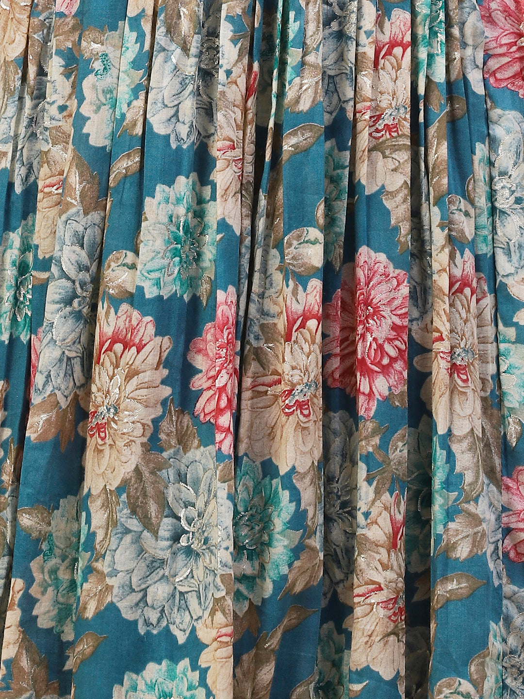 Floral Foil Printed Resham Embellished Empire Maxi Dress - Blue