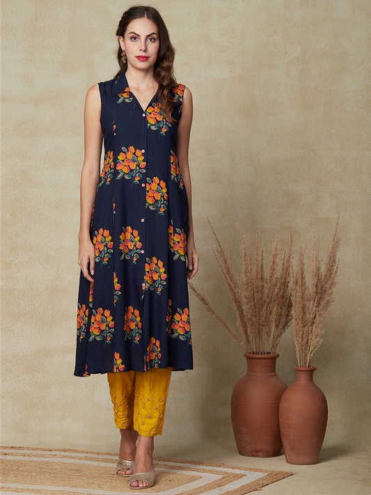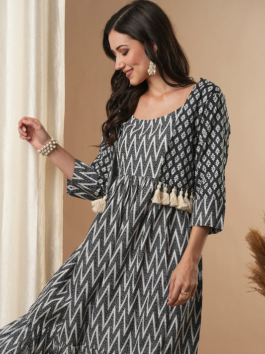 Ethnic Chevron Printed & Embroidered A-Line Kurta...