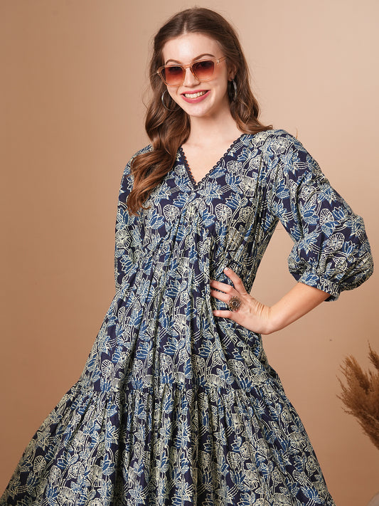 Ethnic Floral Printed A-Line Pleated Tiered Maxi...