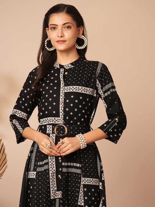 Ethnic Foil Printed Asymmetric Hem Indo-Western Midi...