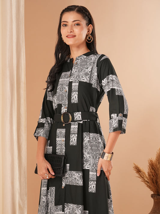 Ethnic Geometric Printed A-Line Flared Midi Dress...