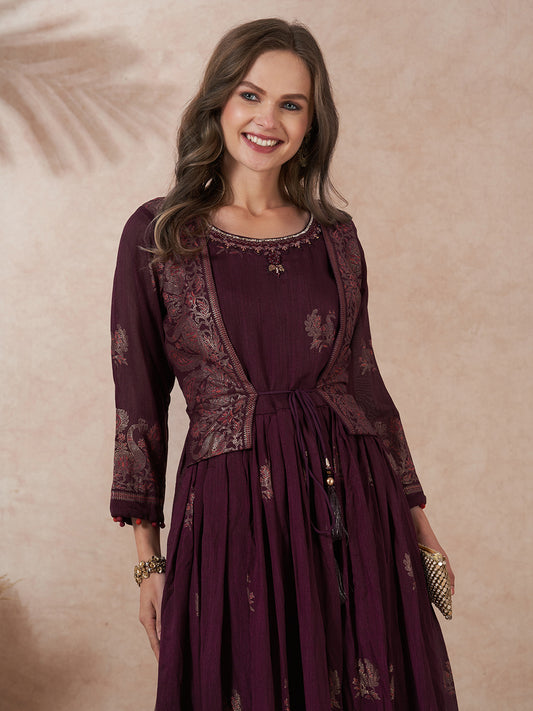 Ethnic Printed Embroidered A-Line Pleated Jacket Style...