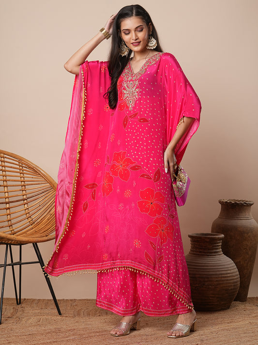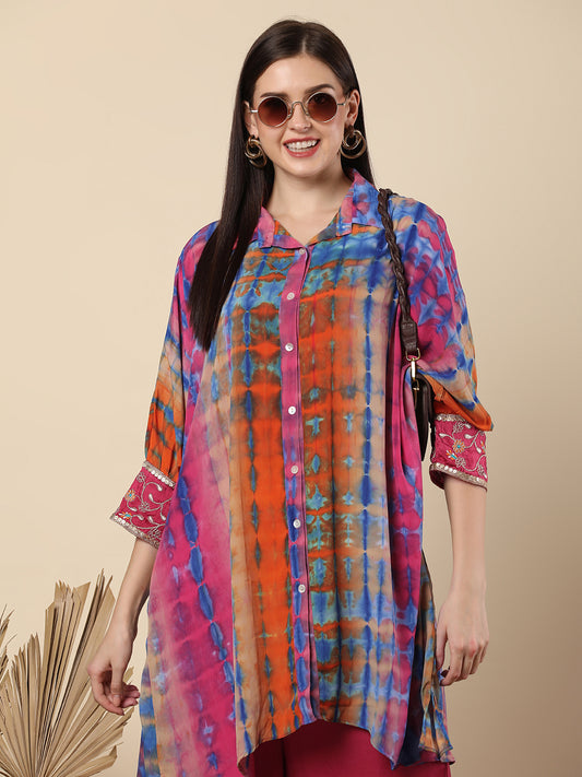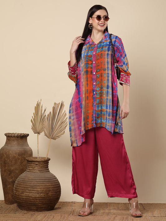 Shibori Printed Embroidered Kaftan Kurta with Palazzo...