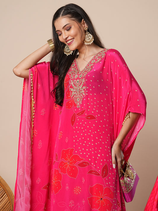 Floral Printed Mirror & Sequins Embroidered Kaftan...
