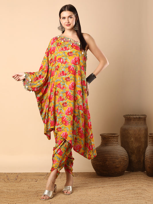 Abstract Floral Embroidered One Shoulder Kaftan Kurta...