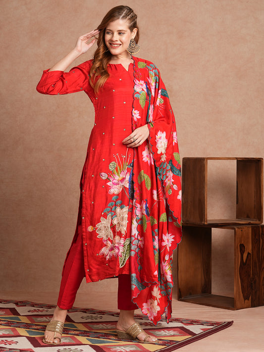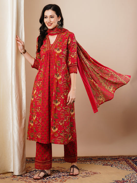 Ethnic Floral Printed A-Line Paneled Kurta with...