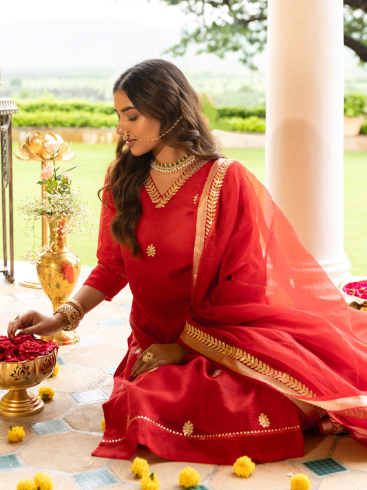 MRP (Inclusive of all taxes)Regular price ₹ 4,599.00₹ 4,599.00 Regular priceUnit price / per₹ 4,599.00Sale priceS M L XL 2XL 3XL add to cart{"id":7605702066262,"title":"Solid Gota Patti Embroidered Straight Fit Kurta Salwar and Dupatta - Red","handle":"solid-gota-patti-embroidered-straight-fit-kurta-salwar-and-dupatta-red","description":"\u003ch1\u003eHighlights\u003cbr\u003e\n\u003c\/h1\u003e\n\u003cp\u003e\u003cbr\u003e-Turn heads in this stunning Red Solid Gota Patti Embroidered Kurta Set, crafted from airy Kota Doria fabric for effortless grace. The straight-fit kurta features a flattering V-neckline and intricate Gota Patti embroidery at the front, adding a timeless festive sparkle. Complemented by a solid salwar and a matching embroidered dupatta, this ensemble is perfect for celebrations where tradition meets elegance.\u003c\/p\u003e\n\u003ch1\u003e\n\u003cbr\u003eFabric \u0026amp; Colour\u003c\/h1\u003e\n\u003cp\u003e\u003cbr\u003eTop Colour: Red\u003cbr\u003eTop Fabric: Supernet\u003cbr\u003eBottom Colour: Red\u003cbr\u003eBottom Fabric: Cotton Blend\u003cbr\u003eDupatta Colour: Red\u003cbr\u003eDupatta Fabric: Supernet\u003c\/p\u003e\n\u003ch1\u003eSpecifications\u003c\/h1\u003e\n\u003cp\u003e\u003cbr\u003eTop Design: Solid\u003cbr\u003eTop Craft: Gota patti\u003cbr\u003eTop Shape: Straight\u003cbr\u003eNeck: V-Neck\u003cbr\u003eSleeve Length: Three-Quarter Sleeves\u003cbr\u003eTop Length: Knee Length\u003cbr\u003eHemline: Straight\u003cbr\u003eSlit: Side Slits\u003c\/p\u003e\n\u003cp\u003eBottom Type: Salwar\u003cbr\u003eBottom Closure: Slip-On\u003cbr\u003eWaistband: Partially Elasticated\u003c\/p\u003e\n\u003cp\u003eDupatta Pattern: Embroidered, Solid\u003cbr\u003eDupatta Border: Taping\u003c\/p\u003e\n\u003cp\u003eWash Care: Hand Wash\u003c\/p\u003e\n\u003cp\u003eLength (in inches)\u003cbr\u003eKurta – 42, Sleeves – 15,\u003cbr\u003eBottom – 38\u003c\/p\u003e\n\u003cp\u003eModel’s Height: 5’7”. Wearing Size S.\u003c\/p\u003e\n\u003ch1\u003eProduct Information\u003c\/h1\u003e\n\u003cp\u003e\u003cbr\u003eManufactured\/Packed\/Marketed By:\u003cbr\u003eFashor Lifestyle Pvt. Ltd.\u003cbr\u003e28\/30, Sudarshanpura Industrial Area,\u003cbr\u003eJaipur - 302006.\u003cbr\u003eCountry of Origin: India\u003c\/p\u003e","published_at":"2025-07-30T18:05:04+05:30","created_at":"2025-07-30T17:35:04+05:30","vendor":"FASHOR","type":"3P Kurta Set","tags":["2XL","30792","3XL","above-3000","All Styles","casualwear","colour_red","craft_gota-patti","design_solid","fabric_supernet","festivewear","KURTI","kurtis","L","M","meta-size-chart-","now-trending","rakhi","rakhi-favourites","shape_straight"],"price":459900,"price_min":459900,"price_max":459900,"available":true,"price_varies":false,"compare_at_price":459900,"compare_at_price_min":459900,"compare_at_price_max":459900,"compare_at_price_varies":false,"variants":[{"id":42535195148374,"title":"S","option1":"S","option2":null,"option3":null,"sku":"36-ST030792D5OS","requires_shipping":true,"taxable":false,"featured_image":{"id":34809943294038,"product_id":7605702066262,"position":3,"created_at":"2025-07-30T17:36:38+05:30","updated_at":"2025-07-30T17:36:40+05:30","alt":null,"width":1080,"height":1440,"src":"\/\/fashor.com\/cdn\/shop\/files\/31624_3.jpg?v=1753877200","variant_ids":[42535195148374,42535195181142,42535195213910,42535195246678,42535195279446,42535195312214]},"available":false,"name":"Solid Gota Patti Embroidered Straight Fit Kurta Salwar and Dupatta - Red - S","public_title":"S","options":["S"],"price":459900,"weight":0,"compare_at_price":459900,"inventory_quantity":0,"inventory_management":"shopify","inventory_policy":"deny","barcode":"","featured_media":{"alt":null,"id":27013170528342,"position":3,"preview_image":{"aspect_ratio":0.75,"height":1440,"width":1080,"src":"\/\/fashor.com\/cdn\/shop\/files\/31624_3.jpg?v=1753877200"}},"requires_selling_plan":false,"selling_plan_allocations":[],"quantity_rule":{"min":1,"max":null,"increment":1}},{"id":42535195181142,"title":"M","option1":"M","option2":null,"option3":null,"sku":"38-ST030792D5OS","requires_shipping":true,"taxable":false,"featured_image":{"id":34809943294038,"product_id":7605702066262,"position":3,"created_at":"2025-07-30T17:36:38+05:30","updated_at":"2025-07-30T17:36:40+05:30","alt":null,"width":1080,"height":1440,"src":"\/\/fashor.com\/cdn\/shop\/files\/31624_3.jpg?v=1753877200","variant_ids":[42535195148374,42535195181142,42535195213910,42535195246678,42535195279446,42535195312214]},"available":true,"name":"Solid Gota Patti Embroidered Straight Fit Kurta Salwar and Dupatta - Red - M","public_title":"M","options":["M"],"price":459900,"weight":0,"compare_at_price":459900,"inventory_quantity":1,"inventory_management":"shopify","inventory_policy":"deny","barcode":"","featured_media":{"alt":null,"id":27013170528342,"position":3,"preview_image":{"aspect_ratio":0.75,"height":1440,"width":1080,"src":"\/\/fashor.com\/cdn\/shop\/files\/31624_3.jpg?v=1753877200"}},"requires_selling_plan":false,"selling_plan_allocations":[],"quantity_rule":{"min":1,"max":null,"increment":1}},{"id":42535195213910,"title":"L","option1":"L","option2":null,"option3":null,"sku":"40-ST030792D5OS","requires_shipping":true,"taxable":false,"featured_image":{"id":34809943294038,"product_id":7605702066262,"position":3,"created_at":"2025-07-30T17:36:38+05:30","updated_at":"2025-07-30T17:36:40+05:30","alt":null,"width":1080,"height":1440,"src":"\/\/fashor.com\/cdn\/shop\/files\/31624_3.jpg?v=1753877200","variant_ids":[42535195148374,42535195181142,42535195213910,42535195246678,42535195279446,42535195312214]},"available":true,"name":"Solid Gota Patti Embroidered Straight Fit Kurta Salwar and Dupatta - Red - L","public_title":"L","options":["L"],"price":459900,"weight":0,"compare_at_price":459900,"inventory_quantity":1,"inventory_management":"shopify","inventory_policy":"deny","barcode":"","featured_media":{"alt":null,"id":27013170528342,"position":3,"preview_image":{"aspect_ratio":0.75,"height":1440