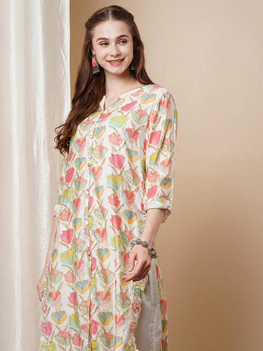 Ethnic Floral Printed Embroidered A-Line Pleated Kurta...