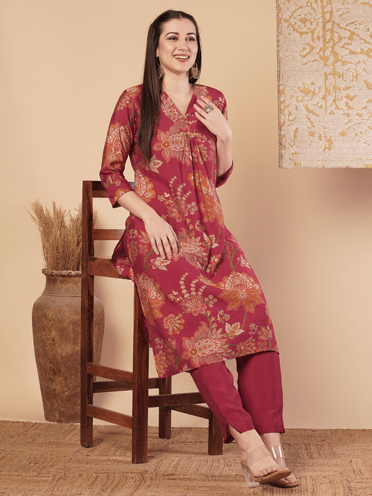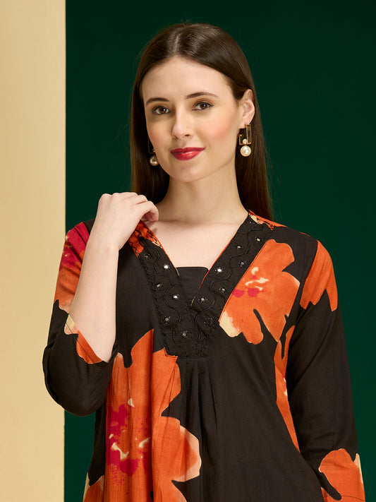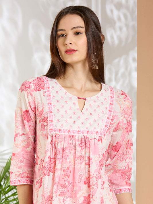 Floral Printed A-Line Cotton Kurta with Pant...