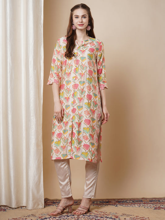 Floral Foil Printed Cutwork Embroidered Straight Kurta...