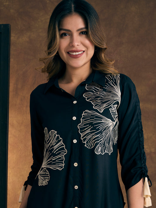 Solid Abstract Floral Embroidered Straight Fit Co-ord...