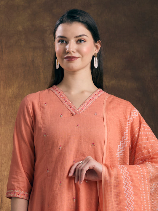 MRP (Inclusive of all taxes)Regular price ₹ 3,049.00₹ 3,049.00 Regular priceUnit price / per₹ 7,699.00Sale priceM L XL 2XL 3XL add to cartSale{"id":7733153333334,"title":"Solid Embroidered A-Line Kurta with Palazzo \u0026 Printed Dupatta - Peach","handle":"solid-embroidered-a-line-kurta-with-palazzo-printed-dupatta-peach","description":"\u003ch1\u003eHighlights\u003cbr\u003e\n\u003c\/h1\u003e\n\u003cp\u003e\u003cbr\u003e-Tailored in breathable cotton slub, this A-line kurta features a refined round neckline highlighted with delicate threadwork embroidery, adding subtle artistry to its timeless silhouette. Paired with a sleek solid palazzo and a lightweight printed Kota Doria dupatta, the ensemble blends comfort with understated sophistication — perfect for celebrations, casual gatherings, or everyday grace.\u003c\/p\u003e\n\u003ch1\u003e\n\u003cbr\u003eFabric \u0026amp; Colour\u003c\/h1\u003e\n\u003cp\u003e\u003cbr\u003eTop Colour: Peach\u003cbr\u003eTop Fabric: Cotton\u003cbr\u003eBottom Colour: Peach\u003cbr\u003eBottom Fabric: Cotton Blend\u003cbr\u003eDupatta Colour: Peach\u003cbr\u003eDupatta Fabric: Supernet\u003c\/p\u003e\n\u003ch1\u003eSpecifications\u003c\/h1\u003e\n\u003cp\u003e\u003cbr\u003eTop Design: Solid\u003cbr\u003eTop Craft: Embroidery, Plain and Prints\u003cbr\u003eTop Shape: A-line\u003cbr\u003eNeck: V-Neck\u003cbr\u003eSleeve Length: Three-Quarter Sleeves\u003cbr\u003eTop Length: Calf Length\u003cbr\u003eHemline: Flared\u003cbr\u003eSlit: Side Slits\u003c\/p\u003e\n\u003cp\u003eBottom Type: Palazzos\u003cbr\u003eBottom Closure: Slip-On\u003cbr\u003eWaistband: Elasticated\u003c\/p\u003e\n\u003cp\u003eDupatta Pattern: Printed\u003cbr\u003eDupatta Border: Printed\u003c\/p\u003e\n\u003cp\u003eWash Care: Machine Wash\u003c\/p\u003e\n\u003cp\u003eLength (in inches)\u003cbr\u003eKurta – 45, Sleeves – 15,\u003cbr\u003eBottom – 44\u003c\/p\u003e\n\u003cp\u003eModel’s Height: 5’7”. Wearing Size S.\u003c\/p\u003e\n\u003ch1\u003eProduct Information\u003c\/h1\u003e\n\u003cp\u003e\u003cbr\u003eManufactured\/Packed\/Marketed By:\u003cbr\u003eFashor Lifestyle Pvt. Ltd.\u003cbr\u003e28\/30, Sudarshanpura Industrial Area,\u003cbr\u003eJaipur - 302006.\u003cbr\u003eCountry of Origin: India\u003c\/p\u003e","published_at":"2025-12-10T12:35:25+05:30","created_at":"2025-12-10T12:00:24+05:30","vendor":"FASHOR","type":"3P Kurta Set","tags":["2XL","33481","3XL","above-3000","All Styles","colour_peach","craft_embroidery","craft_plain-and-prints","design_solid","fabric_cotton","KURTI","kurtis","L","M","meta-size-chart-","now-trending","shape_a-line","workwear","XL"],"price":304900,"price_min":304900,"price_max":304900,"available":true,"price_varies":false,"compare_at_price":769900,"compare_at_price_min":769900,"compare_at_price_max":769900,"compare_at_price_varies":false,"variants":[{"id":43724441682006,"title":"M","option1":"M","option2":null,"option3":null,"sku":"38-STB33481J5FS","requires_shipping":true,"taxable":true,"featured_image":{"id":35858836553814,"product_id":7733153333334,"position":1,"created_at":"2025-12-10T12:01:33+05:30","updated_at":"2025-12-10T12:01:35+05:30","alt":null,"width":1080,"height":1440,"src":"\/\/fashor.com\/cdn\/shop\/files\/32893_1.jpg?v=1765348295","variant_ids":[43724441682006,43724441714774,43724441747542,43724441780310,43724441813078]},"available":true,"name":"Solid Embroidered A-Line Kurta with Palazzo \u0026 Printed Dupatta - Peach - M","public_title":"M","options":["M"],"price":304900,"weight":0,"compare_at_price":769900,"inventory_quantity":5,"inventory_management":"shopify","inventory_policy":"deny","barcode":"","featured_media":{"alt":null,"id":27936728023126,"position":1,"preview_image":{"aspect_ratio":0.75,"height":1440,"width":1080,"src":"\/\/fashor.com\/cdn\/shop\/files\/32893_1.jpg?v=1765348295"}},"requires_selling_plan":false,"selling_plan_allocations":[],"quantity_rule":{"min":1,"max":null,"increment":1}},{"id":43724441714774,"title":"L","option1":"L","option2":null,"option3":null,"sku":"40-STB33481J5FS","requires_shipping":true,"taxable":true,"featured_image":{"id":35858836553814,"product_id":7733153333334,"position":1,"created_at":"2025-12-10T12:01:33+05:30","updated_at":"2025-12-10T12:01:35+05:30","alt":null,"width":1080,"height":1440,"src":"\/\/fashor.com\/cdn\/shop\/files\/32893_1.jpg?v=1765348295","variant_ids":[43724441682006,43724441714774,43724441747542,43724441780310,43724441813078]},"available":true,"name":"Solid Embroidered A-Line Kurta with Palazzo \u0026 Printed Dupatta - Peach - L","public_title":"L","options":["L"],"price":304900,"weight":0,"compare_at_price":769900,"inventory_quantity":6,"inventory_management":"shopify","inventory_policy":"deny","barcode":"","featured_media":{"alt":null,"id":27936728023126,"position":1,"preview_image":{"aspect_ratio":0.75,"height":1440,"width":1080,"src":"\/\/fashor.com\/cdn\/shop\/files\/32893_1.jpg?v=1765348295"}},"requires_selling_plan":false,"selling_plan_allocations":[],"quantity_rule":{"min":1,"max":null,"increment":1}},{"id":43724441747542,"title":"XL","option1":"XL","option2":null,"option3":null,"sku":"42-STB33481J5FS","requires_shipping":true,"taxable":true,"featured_image":{"id":35858836553814,"product_id":7733153333334,"position":1,"created_at":"2025-12-10T12:01:33+05:30","updated_at":"2025-12-10T12:01:35+05:30","alt":null,"width":1080,"height":1440,"src":"\/\/fashor.com\/cdn\/shop\/files\/32893_1.jpg?v=1765348295","variant_ids":[43724441682006,43724441714774,43724441747542,43724441780310,43724441813078]},"available":true,"name":"Solid Embroidered A-Line Kurta with Palazzo \u0026 Printed Dupatta - Peach - XL","public_title":"XL","options":["XL"],"price":304900,"weight":0,"compare_at_price":769900,"inventory_quantity":6,"inventory_management":"shopify","inventory_policy":"deny","barcode":"","featured_media":{"alt":null,"id":27936728023126,"position":1,"preview_image":{"aspect_ratio":0.75,"height":1440,"width":1080,"src":"\/\/fashor.com\/cdn\/shop\/files\/32893_1.jpg?