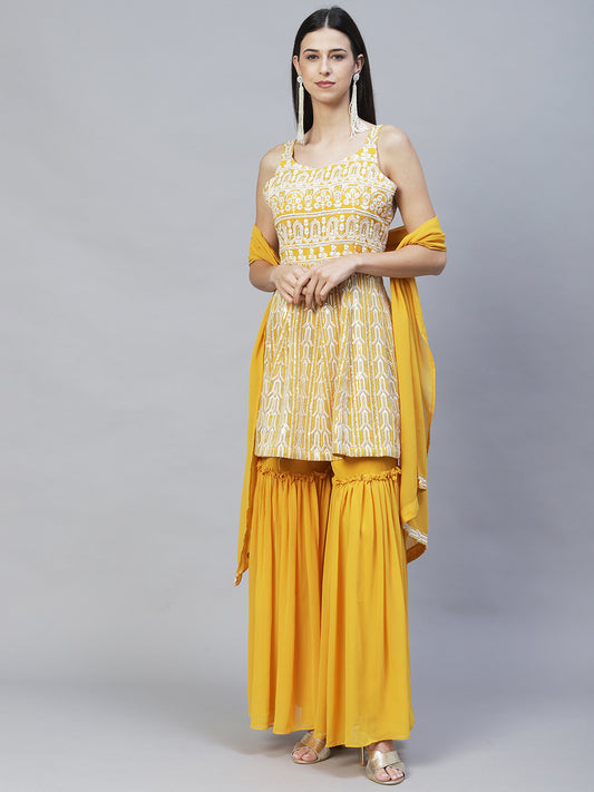 MRP (Inclusive of all taxes)Regular price ₹ 4,699.00₹ 4,699.00 Regular priceUnit price / per₹ 10,499.00Sale priceL XL 2XL 3XL add to cartSale{"id":6807021191254,"title":"Ethnic Embroidered Anarkali Kurta with Sharara \u0026 Dupatta - Yellow","handle":"ethnic-embroidered-anarkali-kurta-with-sharara-dupatta-yellow","description":"\u003cp data-mce-fragment=\"1\"\u003e\u003cspan style=\"font-weight: 400;\" data-mce-fragment=\"1\" data-mce-style=\"font-weight: 400;\"\u003e\u003c\/span\u003e\u003cspan style=\"font-weight: 400;\" data-mce-fragment=\"1\" data-mce-style=\"font-weight: 400;\"\u003eStyle: Kurta - Anarkali, Bottom - Sharara\u003c\/span\u003e\u003c\/p\u003e\n\u003cp data-mce-fragment=\"1\"\u003e\u003cspan style=\"font-weight: 400;\" data-mce-fragment=\"1\" data-mce-style=\"font-weight: 400;\"\u003eType: Party Wear\u003c\/span\u003e\u003c\/p\u003e\n\u003cp data-mce-fragment=\"1\"\u003e\u003cspan style=\"font-weight: 400;\" data-mce-fragment=\"1\" data-mce-style=\"font-weight: 400;\"\u003eNeckline: Strappy Neckline\u003c\/span\u003e\u003c\/p\u003e\n\u003cp data-mce-fragment=\"1\"\u003e\u003cspan style=\"font-weight: 400;\" data-mce-fragment=\"1\" data-mce-style=\"font-weight: 400;\"\u003eSleeve Pattern: Regular Sleeves\u003c\/span\u003e\u003c\/p\u003e\n\u003cp data-mce-fragment=\"1\"\u003e\u003cspan style=\"font-weight: 400;\" data-mce-fragment=\"1\" data-mce-style=\"font-weight: 400;\"\u003eSleeve Length: 3\/4th Sleeves\u003c\/span\u003e\u003c\/p\u003e\n\u003cp data-mce-fragment=\"1\"\u003e\u003cspan style=\"font-weight: 400;\" data-mce-fragment=\"1\" data-mce-style=\"font-weight: 400;\"\u003eProduct Details:\u003c\/span\u003e\u003c\/p\u003e\n\u003cul data-mce-fragment=\"1\"\u003e\n\u003cli data-mce-fragment=\"1\"\u003e\u003cspan style=\"font-weight: 400;\" data-mce-fragment=\"1\" data-mce-style=\"font-weight: 400;\"\u003e Anarkali Flared Short Kurta\u003c\/span\u003e\u003c\/li\u003e\n\u003cli data-mce-fragment=\"1\"\u003e\u003cspan style=\"font-weight: 400;\" data-mce-fragment=\"1\" data-mce-style=\"font-weight: 400;\"\u003e Ethnic Embroidered all over \u003c\/span\u003e\u003c\/li\u003e\n\u003cli data-mce-fragment=\"1\"\u003e\u003cspan style=\"font-weight: 400;\" data-mce-fragment=\"1\" data-mce-style=\"font-weight: 400;\"\u003e Embellished with Sequin Work\u003c\/span\u003e\u003c\/li\u003e\n\u003cli data-mce-fragment=\"1\"\u003e\u003cspan style=\"font-weight: 400;\" data-mce-fragment=\"1\" data-mce-style=\"font-weight: 400;\"\u003e Detachable Sleeves inside the Garment\u003c\/span\u003e\u003c\/li\u003e\n\u003cli data-mce-fragment=\"1\"\u003e\u003cspan style=\"font-weight: 400;\" data-mce-fragment=\"1\" data-mce-style=\"font-weight: 400;\"\u003e Side Zipper Closure \u003c\/span\u003e\u003c\/li\u003e\n\u003cli data-mce-fragment=\"1\"\u003e\u003cspan style=\"font-weight: 400;\" data-mce-fragment=\"1\" data-mce-style=\"font-weight: 400;\"\u003e Styled with Simple Silhouette\u003c\/span\u003e\u003c\/li\u003e\n\u003cli data-mce-fragment=\"1\"\u003e\u003cspan style=\"font-weight: 400;\" data-mce-fragment=\"1\" data-mce-style=\"font-weight: 400;\"\u003e Paired with Solid Sharara\u003c\/span\u003e\u003c\/li\u003e\n\u003cli data-mce-fragment=\"1\"\u003e\u003cspan style=\"font-weight: 400;\" data-mce-fragment=\"1\" data-mce-style=\"font-weight: 400;\"\u003e Slip-on Closure\u003c\/span\u003e\u003c\/li\u003e\n\u003cli data-mce-fragment=\"1\"\u003e\u003cspan style=\"font-weight: 400;\" data-mce-fragment=\"1\" data-mce-style=\"font-weight: 400;\"\u003e Elasticated Waistline\u003c\/span\u003e\u003c\/li\u003e\n\u003cli data-mce-fragment=\"1\"\u003e\u003cspan style=\"font-weight: 400;\" data-mce-fragment=\"1\" data-mce-style=\"font-weight: 400;\"\u003e Teamed with Solid Matching Dupatta\u003c\/span\u003e\u003c\/li\u003e\n\u003cli data-mce-fragment=\"1\"\u003e\u003cspan style=\"font-weight: 400;\" data-mce-fragment=\"1\" data-mce-style=\"font-weight: 400;\"\u003e Enhanced with Embroidered Border Detailing \u003c\/span\u003e\u003c\/li\u003e\n\u003c\/ul\u003e\n\u003cp data-mce-fragment=\"1\"\u003e\u003cspan style=\"font-weight: 400;\" data-mce-fragment=\"1\" data-mce-style=\"font-weight: 400;\"\u003eModel’s Height: 5’7” ft. Size: Wearing Size S.\u003c\/span\u003e\u003c\/p\u003e\n\u003ch1 data-mce-fragment=\"1\"\u003e\u003cspan style=\"font-weight: 400;\" data-mce-fragment=\"1\" data-mce-style=\"font-weight: 400;\"\u003eFabric Details\u003c\/span\u003e\u003c\/h1\u003e\n\u003cp data-mce-fragment=\"1\"\u003e\u003cspan style=\"font-weight: 400;\" data-mce-fragment=\"1\" data-mce-style=\"font-weight: 400;\"\u003eColour: Kurta - Yellow, Bottom - Yellow, Dupatta - Yellow \u003c\/span\u003e\u003c\/p\u003e\n\u003cp data-mce-fragment=\"1\"\u003e\u003cspan style=\"font-weight: 400;\" data-mce-fragment=\"1\" data-mce-style=\"font-weight: 400;\"\u003eFabric: Kurta - Georgette, Bottom - Georgette, Dupatta - Georgette\u003c\/span\u003e\u003c\/p\u003e\n\u003cp data-mce-fragment=\"1\"\u003e\u003cspan style=\"font-weight: 400;\" data-mce-fragment=\"1\" data-mce-style=\"font-weight: 400;\"\u003eWash Care: Dry Clean\u003c\/span\u003e\u003c\/p\u003e\n\u003ch1\u003eGarment Measurements\u003c\/h1\u003e\n\u003cp\u003e\u003cstrong\u003eMeasurement (in inches) \u003c\/strong\u003e\u003c\/p\u003e\n\u003cp\u003eLength – 33, Sleeveless,\u003c\/p\u003e\n\u003cp\u003eBottom - 43\u003c\/p\u003e\n\u003ch1 data-mce-fragment=\"1\"\u003e\u003cspan data-mce-fragment=\"1\"\u003eProduct Information\u003c\/span\u003e\u003c\/h1\u003e\n\u003cp data-mce-fragment=\"1\"\u003e\u003cspan data-mce-fragment=\"1\"\u003e\u003cstrong\u003eManufactured\/Packed\/Marketed By:\u003c\/strong\u003e\u003cbr\u003e\u003c\/span\u003e\u003cspan data-mce-fragment=\"1\"\u003eFashor Lifestyle Pvt. Ltd.\u003cbr\u003e28\/30, Sudershanpura Industrial Area,\u003cbr\u003eJaipur - 302006.\u003cbr\u003e\u003cstrong\u003eCountry of Origin:\u003c\/strong\u003e India\u003c\/span\u003e\u003c\/p\u003e","published_at":"2024-06-05T10:06:39+05:30","created_at":"2022-09
