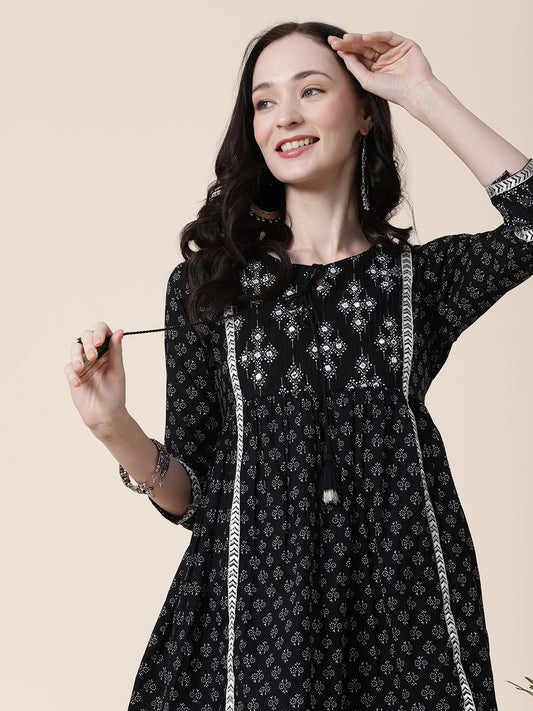 • Ethnic Printed Mirror Embroidered Peplum Kurta With...