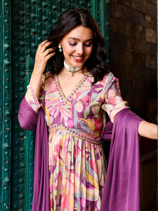 Ethnic Floral Printed & Embroidered A-Line Kurta...