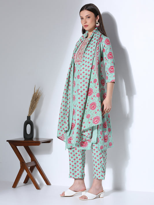 Ethnic Floral Printed & Embroidered Straight Fit...