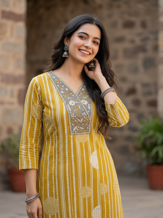 MRP (Inclusive of all taxes)Regular price ₹ 1,699.00₹ 1,699.00 Regular priceUnit price / per₹ 4,299.00Sale priceM L XL 2XL add to cartSale{"id":7833436717142,"title":"Ethnic Paisley Printed Mirror Work Straight Kurta with Palazzo - Mustard","handle":"ethnic-paisley-printed-mirror-work-straight-kurta-with-palazzo-mustard","description":"\u003ch1\u003e\u003cstrong\u003eHighlights\u003c\/strong\u003e\u003c\/h1\u003e\n\u003cp\u003eThis two-piece cotton set features a coordinated striped and ethnic paisley print in mustard base. Designed in a straight silhouette with a slight A-line flare, it offers both structure and ease. The round neckline is enhanced with a contrast asymmetric yoke that extends to one side of the chest, adding a modern touch. The yoke is detailed with multi-color embroidery and delicate mirror work with an inner contrast base that further elevates the design.\u003c\/p\u003e\n\u003cp\u003ePerfect for regular or office wear, this set blends comfort with understated ethnic charm.\u003c\/p\u003e\n\n\u003ch1\u003e\u003cstrong\u003eFabric \u0026amp; Colour\u003c\/strong\u003e\u003c\/h1\u003e\n\u003cul\u003e\n\u003cli\u003eTop Colour: Mustard\u003c\/li\u003e\n\u003cli\u003eTop Fabric: Cotton\u003c\/li\u003e\n\u003cli\u003eBottom Colour: Mustard\u003c\/li\u003e\n\u003cli\u003eBottom Fabric: Pure Cotton\u003c\/li\u003e\n\u003c\/ul\u003e\n\n\u003ch1\u003e\u003cstrong\u003eSpecifications\u003c\/strong\u003e\u003c\/h1\u003e\n\u003cul\u003e\n\u003cli\u003eTop Design: Ethnic print\u003c\/li\u003e\n\u003cli\u003eTop Craft: Mirror work, Embroidery\u003c\/li\u003e\n\u003cli\u003eTop Shape: Straight\u003c\/li\u003e\n\u003cli\u003eNeck: Round Neck\u003c\/li\u003e\n\u003cli\u003eSleeve Length: Three-Quarter Sleeves\u003c\/li\u003e\n\u003cli\u003eTop Length: Calf Length\u003c\/li\u003e\n\u003cli\u003eHemline: Straight\u003c\/li\u003e\n\u003cli\u003eSlit: Side Slits\u003c\/li\u003e\n\u003cli\u003eBottom Type: Palazzos\u003c\/li\u003e\n\u003cli\u003eBottom Closure: Slip-On\u003c\/li\u003e\n\u003cli\u003eWaistband: Elasticated\u003c\/li\u003e\n\u003c\/ul\u003e\n\n\u003cp\u003e\u003cstrong\u003eWash Care:\u003c\/strong\u003e Hand Wash\u003c\/p\u003e\n\n\u003ch1\u003e\u003cstrong\u003eLength (in inches)\u003c\/strong\u003e\u003c\/h1\u003e\n\u003cp\u003eKurta – 46, Sleeves – 17\u003cbr\u003eBottom – 36\u003c\/p\u003e\n\n\u003cp\u003eModel's Height: 5'7\". Wearing Size S.\u003c\/p\u003e\n\n\u003ch1\u003e\u003cstrong\u003eProduct Information\u003c\/strong\u003e\u003c\/h1\u003e\n\u003cp\u003eManufactured\/Packed\/Marketed By:\u003cbr\u003eFashor Lifestyle Pvt. Ltd.\u003cbr\u003e28\/30, Sudarshanpura Industrial Area,\u003cbr\u003eJaipur - 302006.\u003cbr\u003eCountry of Origin: India\u003c\/p\u003e","published_at":"2026-03-28T20:11:51+05:30","created_at":"2026-03-28T20:06:56+05:30","vendor":"FASHOR","type":"2P Kurta Set","tags":["1001-2000","2XL","casualwear","co-ord","Co-ord Set","colour_mustard","craft_mirror-work","design_ethnic-print","Everyday Wear","fabric_cotton","Kurta Set","L","M","Mirror Work","Office Wear","shape_straight","workwear","XL"],"price":169900,"price_min":169900,"price_max":169900,"available":true,"price_varies":false,"compare_at_price":429900,"compare_at_price_min":429900,"compare_at_price_max":429900,"compare_at_price_varies":false,"variants":[{"id":44262950830166,"title":"M","option1":"M","option2":null,"option3":null,"sku":"38-KBA34724B6FS","requires_shipping":true,"taxable":true,"featured_image":{"id":36559799877718,"product_id":7833436717142,"position":1,"created_at":"2026-03-28T20:02:53+05:30","updated_at":"2026-03-28T20:02:55+05:30","alt":null,"width":1080,"height":1440,"src":"\/\/fashor.com\/cdn\/shop\/files\/33184_1.png?v=1774708375","variant_ids":[44262950830166,44262950862934,44262950895702,44262950928470]},"available":true,"name":"Ethnic Paisley Printed Mirror Work Straight Kurta with Palazzo - Mustard - M","public_title":"M","options":["M"],"price":169900,"weight":0,"compare_at_price":429900,"inventory_quantity":2,"inventory_management":"shopify","inventory_policy":"deny","barcode":"","featured_media":{"alt":null,"id":28573569253462,"position":1,"preview_image":{"aspect_ratio":0.75,"height":1440,"width":1080,"src":"\/\/fashor.com\/cdn\/shop\/files\/33184_1.png?v=1774708375"}},"requires_selling_plan":false,"selling_plan_allocations":[]},{"id":44262950862934,"title":"L","option1":"L","option2":null,"option3":null,"sku":"40-KBA34724B6FS","requires_shipping":true,"taxable":true,"featured_image":{"id":36559799877718,"product_id":7833436717142,"position":1,"created_at":"2026-03-28T20:02:53+05:30","updated_at":"2026-03-28T20:02:55+05:30","alt":null,"width":1080,"height":1440,"src":"\/\/fashor.com\/cdn\/shop\/files\/33184_1.png?v=1774708375","variant_ids":[44262950830166,44262950862934,44262950895702,44262950928470]},"available":true,"name":"Ethnic Paisley Printed Mirror Work Straight Kurta with Palazzo - Mustard - L","public_title":"L","options":["L"],"price":169900,"weight":0,"compare_at_price":429900,"inventory_quantity":3,"inventory_management":"shopify","inventory_policy":"deny","barcode":"","featured_media":{"alt":null,"id":28573569253462,"position":1,"preview_image":{"aspect_ratio":0.75,"height":1440,"width":1080,"src":"\/\/fashor.com\/cdn\/shop\/files\/33184_1.png?v=1774708375"}},"requires_selling_plan":false,"selling_plan_allocations":[]},{"id":44262950895702,"title":"XL","option1":"XL","option2":null,"option3":null,"sku":"42-KBA34724B6FS","requires_shipping":true,"taxable":true,"featured_image":{"id":36559799877718,"product_id":7833436717142,"position":1,"created_at":"2026-03-28T20:02:53+05:30","updated_at":"2026-03-28T20:02:55+05:30","alt":null,"width":1080,"height":1440,"src":"\/\/fashor.com\/cdn\/shop\/files\/33184_1.png?v=1774708375","variant_ids":[44262950830166,44262950862934,44262950895702,44262950928470]},"available":true,"name":"Ethnic Paisley Printed Mirror Work Straight Kurta with Palazzo - Mustard - XL","public_title":"XL","options":["XL"],"