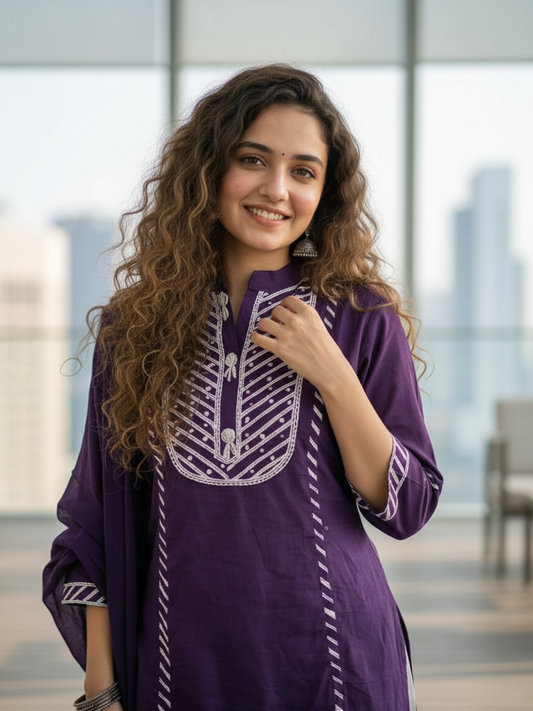 MRP (Inclusive of all taxes)Regular price ₹ 2,499.00₹ 2,499.00 Regular priceUnit price / per₹ 6,399.00Sale priceM L XL 2XL add to cartSale{"id":7832974622806,"title":"Lehariya Printed Mirror Work Straight Kurta with Palazzo \u0026 Dupatta - Purple","handle":"lehariya-printed-mirror-work-straight-kurta-with-palazzo-dupatta-purple","description":"\u003ch1\u003e\u003cstrong\u003eHighlights\u003c\/strong\u003e\u003c\/h1\u003e\n\u003cp\u003eThis elegant three-piece suit set is crafted in comfortable cotton in a rich purple shade. The kurta features a beautifully designed yoke embellished with delicate hand mirror work and handwork buttons, creating a subtle yet eye-catching focal point. Minimal printed detailing along the kurta enhances the overall design with a refined contrast. Paired with white printed palazzo pants that add a soft balance to the deep hue of the kurta while maintaining a relaxed and stylish look.\u003c\/p\u003e\n\u003cp\u003eThe ensemble is completed with a coordinated dupatta that complements the outfit's color palette and printed accents. Comfortable yet distinctive, this set is perfect for everyday wear as well as casual gatherings.\u003c\/p\u003e\n\n\u003ch1\u003e\u003cstrong\u003eFabric \u0026amp; Colour\u003c\/strong\u003e\u003c\/h1\u003e\n\u003cul\u003e\n\u003cli\u003eTop Colour: Purple\u003c\/li\u003e\n\u003cli\u003eTop Fabric: Cotton\u003c\/li\u003e\n\u003cli\u003eBottom Colour: White\u003c\/li\u003e\n\u003cli\u003eBottom Fabric: Pure Cotton\u003c\/li\u003e\n\u003cli\u003eDupatta Colour: Purple\u003c\/li\u003e\n\u003cli\u003eDupatta Fabric: Voile\u003c\/li\u003e\n\u003c\/ul\u003e\n\n\u003ch1\u003e\u003cstrong\u003eSpecifications\u003c\/strong\u003e\u003c\/h1\u003e\n\u003cul\u003e\n\u003cli\u003eTop Design: Lehariya Print, Solid\u003c\/li\u003e\n\u003cli\u003eTop Craft: Mirror work\u003c\/li\u003e\n\u003cli\u003eTop Shape: Straight\u003c\/li\u003e\n\u003cli\u003eNeck: Band Collar\u003c\/li\u003e\n\u003cli\u003eSleeve Length: Three-Quarter Sleeves\u003c\/li\u003e\n\u003cli\u003eTop Length: Calf Length\u003c\/li\u003e\n\u003cli\u003eHemline: Straight\u003c\/li\u003e\n\u003cli\u003eSlit: Side Slits\u003c\/li\u003e\n\u003cli\u003eBottom Type: Palazzos\u003c\/li\u003e\n\u003cli\u003eBottom Closure: Slip-On\u003c\/li\u003e\n\u003cli\u003eWaistband: Elasticated\u003c\/li\u003e\n\u003cli\u003eDupatta Pattern: Solid\u003c\/li\u003e\n\u003cli\u003eDupatta Border: Taping\u003c\/li\u003e\n\u003c\/ul\u003e\n\n\u003cp\u003e\u003cstrong\u003eWash Care:\u003c\/strong\u003e Dry Clean\u003c\/p\u003e\n\n\u003ch1\u003e\u003cstrong\u003eLength (in inches)\u003c\/strong\u003e\u003c\/h1\u003e\n\u003cp\u003eKurta – 46, Sleeves – 17\u003cbr\u003eBottom – 38\u003c\/p\u003e\n\n\u003cp\u003eModel's Height: 5'7\". Wearing Size S.\u003c\/p\u003e\n\n\u003ch1\u003e\u003cstrong\u003eProduct Information\u003c\/strong\u003e\u003c\/h1\u003e\n\u003cp\u003eManufactured\/Packed\/Marketed By:\u003cbr\u003eFashor Lifestyle Pvt. Ltd.\u003cbr\u003e28\/30, Sudarshanpura Industrial Area,\u003cbr\u003eJaipur - 302006.\u003cbr\u003eCountry of Origin: India\u003c\/p\u003e","published_at":"2026-03-27T20:32:24+05:30","created_at":"2026-03-27T19:27:16+05:30","vendor":"FASHOR","type":"3P Kurta Set","tags":["2001-3000","2XL","casualwear","colour_purple","craft_mirror-work","design_lehariya-print","Everyday Wear","fabric_cotton","Kurta Set","L","M","Mirror Work","occasionwear","Palazzo","shape_straight","XL"],"price":249900,"price_min":249900,"price_max":249900,"available":true,"price_varies":false,"compare_at_price":639900,"compare_at_price_min":639900,"compare_at_price_max":639900,"compare_at_price_varies":false,"variants":[{"id":44241502273622,"title":"M","option1":"M","option2":null,"option3":null,"sku":"38-ST034755B6FS","requires_shipping":true,"taxable":true,"featured_image":{"id":36556731252822,"product_id":7832974622806,"position":1,"created_at":"2026-03-27T19:23:25+05:30","updated_at":"2026-03-27T19:23:27+05:30","alt":null,"width":1080,"height":1440,"src":"\/\/fashor.com\/cdn\/shop\/files\/33200_1.jpg?v=1774619607","variant_ids":[44241502273622,44241502306390,44241502339158,44241502371926]},"available":true,"name":"Lehariya Printed Mirror Work Straight Kurta with Palazzo \u0026 Dupatta - Purple - M","public_title":"M","options":["M"],"price":249900,"weight":0,"compare_at_price":639900,"inventory_quantity":1,"inventory_management":"shopify","inventory_policy":"deny","barcode":"","featured_media":{"alt":null,"id":28570557382742,"position":1,"preview_image":{"aspect_ratio":0.75,"height":1440,"width":1080,"src":"\/\/fashor.com\/cdn\/shop\/files\/33200_1.jpg?v=1774619607"}},"requires_selling_plan":false,"selling_plan_allocations":[]},{"id":44241502306390,"title":"L","option1":"L","option2":null,"option3":null,"sku":"40-ST034755B6FS","requires_shipping":true,"taxable":true,"featured_image":{"id":36556731252822,"product_id":7832974622806,"position":1,"created_at":"2026-03-27T19:23:25+05:30","updated_at":"2026-03-27T19:23:27+05:30","alt":null,"width":1080,"height":1440,"src":"\/\/fashor.com\/cdn\/shop\/files\/33200_1.jpg?v=1774619607","variant_ids":[44241502273622,44241502306390,44241502339158,44241502371926]},"available":true,"name":"Lehariya Printed Mirror Work Straight Kurta with Palazzo \u0026 Dupatta - Purple - L","public_title":"L","options":["L"],"price":249900,"weight":0,"compare_at_price":639900,"inventory_quantity":1,"inventory_management":"shopify","inventory_policy":"deny","barcode":"","featured_media":{"alt":null,"id":28570557382742,"position":1,"preview_image":{"aspect_ratio":0.75,"height":1440,"width":1080,"src":"\/\/fashor.com\/cdn\/shop\/files\/33200_1.jpg?v=1774619607"}},"requires_selling_plan":false,"selling_plan_allocations":[]},{"id":44241502339158,"title":"XL","option1":"XL","option2":null,"option3":null,"sku":"42-ST034755B6FS","requires_shipping":true,"taxable":true,"featured_image":{"id":36556731252822,"product_id":7832974622806,"position":1,"created_at":"2026-03-27T19:23:25+05:30"