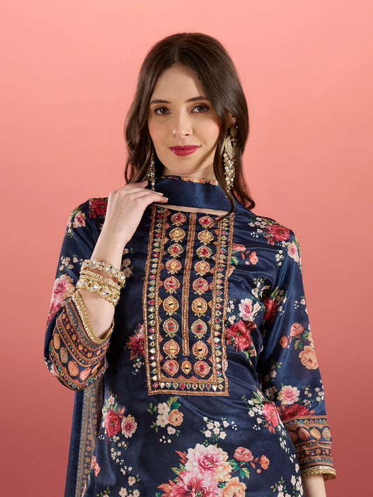 Ethnic Floral Printed & Embroidered Straight Fit...