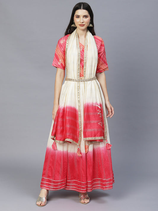 MRP (Inclusive of all taxes)Regular price ₹ 4,499.00₹ 4,499.00 Regular priceUnit price / per₹ 9,999.00Sale priceM L XL 2XL add to cartSale{"id":6818204287062,"title":"Ethnic Printed Short Top with Flared Skirt \u0026 Dupatta - Pink","handle":"ethnic-printed-short-top-with-flared-skirt-dupatta-pink","description":"\u003cp data-mce-fragment=\"1\"\u003e\u003cspan style=\"font-weight: 400;\" data-mce-fragment=\"1\" data-mce-style=\"font-weight: 400;\"\u003e\u003c\/span\u003e\u003cspan style=\"font-weight: 400;\" data-mce-fragment=\"1\" data-mce-style=\"font-weight: 400;\"\u003eStyle: Kurta - Short Top, Bottom - Flared Skirt \u003c\/span\u003e\u003c\/p\u003e\n\u003cp data-mce-fragment=\"1\"\u003e\u003cspan style=\"font-weight: 400;\" data-mce-fragment=\"1\" data-mce-style=\"font-weight: 400;\"\u003eType: Party Wear \u003c\/span\u003e\u003c\/p\u003e\n\u003cp data-mce-fragment=\"1\"\u003e\u003cspan style=\"font-weight: 400;\" data-mce-fragment=\"1\" data-mce-style=\"font-weight: 400;\"\u003eNeckline: Leaf Neckline\u003c\/span\u003e\u003c\/p\u003e\n\u003cp data-mce-fragment=\"1\"\u003e\u003cspan style=\"font-weight: 400;\" data-mce-fragment=\"1\" data-mce-style=\"font-weight: 400;\"\u003eSleeve Pattern: Regular Sleeves\u003c\/span\u003e\u003c\/p\u003e\n\u003cp data-mce-fragment=\"1\"\u003e\u003cspan style=\"font-weight: 400;\" data-mce-fragment=\"1\" data-mce-style=\"font-weight: 400;\"\u003eSleeve Length: Elbow Sleeves\u003c\/span\u003e\u003c\/p\u003e\n\u003cp data-mce-fragment=\"1\"\u003e\u003cspan style=\"font-weight: 400;\" data-mce-fragment=\"1\" data-mce-style=\"font-weight: 400;\"\u003eProduct Details:\u003c\/span\u003e\u003c\/p\u003e\n\u003cul data-mce-fragment=\"1\"\u003e\n\u003cli data-mce-fragment=\"1\"\u003e\u003cspan style=\"font-weight: 400;\" data-mce-fragment=\"1\" data-mce-style=\"font-weight: 400;\"\u003e Short Top\u003c\/span\u003e\u003c\/li\u003e\n\u003cli data-mce-fragment=\"1\"\u003e\u003cspan style=\"font-weight: 400;\" data-mce-fragment=\"1\" data-mce-style=\"font-weight: 400;\"\u003e Ethnic Prints all over\u003c\/span\u003e\u003c\/li\u003e\n\u003cli data-mce-fragment=\"1\"\u003e\u003cspan style=\"font-weight: 400;\" data-mce-fragment=\"1\" data-mce-style=\"font-weight: 400;\"\u003e Highlighted with Foil Prints \u003c\/span\u003e\u003c\/li\u003e\n\u003cli data-mce-fragment=\"1\"\u003e\u003cspan style=\"font-weight: 400;\" data-mce-fragment=\"1\" data-mce-style=\"font-weight: 400;\"\u003e Tie-ups with Tassels Detailing at Back Neckline \u003c\/span\u003e\u003c\/li\u003e\n\u003cli data-mce-fragment=\"1\"\u003e\u003cspan style=\"font-weight: 400;\" data-mce-fragment=\"1\" data-mce-style=\"font-weight: 400;\"\u003e Smocking Detailing at back \u003c\/span\u003e\u003c\/li\u003e\n\u003cli data-mce-fragment=\"1\"\u003e\u003cspan style=\"font-weight: 400;\" data-mce-fragment=\"1\" data-mce-style=\"font-weight: 400;\"\u003e Styled with Simple Silhouette\u003c\/span\u003e\u003c\/li\u003e\n\u003cli data-mce-fragment=\"1\"\u003e\u003cspan style=\"font-weight: 400;\" data-mce-fragment=\"1\" data-mce-style=\"font-weight: 400;\"\u003e Comes with Embroidered Tie-Up Belt \u003c\/span\u003e\u003c\/li\u003e\n\u003cli data-mce-fragment=\"1\"\u003e\u003cspan style=\"font-weight: 400;\" data-mce-fragment=\"1\" data-mce-style=\"font-weight: 400;\"\u003e Embellished with Sequin \u0026amp; Gota Patti Work\u003c\/span\u003e\u003c\/li\u003e\n\u003cli data-mce-fragment=\"1\"\u003e\u003cspan style=\"font-weight: 400;\" data-mce-fragment=\"1\" data-mce-style=\"font-weight: 400;\"\u003e Paired with Ombre Dyed Flared Skirt \u003c\/span\u003e\u003c\/li\u003e\n\u003cli data-mce-fragment=\"1\"\u003e\u003cspan style=\"font-weight: 400;\" data-mce-fragment=\"1\" data-mce-style=\"font-weight: 400;\"\u003e Lurex Stripes all over \u003c\/span\u003e\u003c\/li\u003e\n\u003cli data-mce-fragment=\"1\"\u003e\u003cspan style=\"font-weight: 400;\" data-mce-fragment=\"1\" data-mce-style=\"font-weight: 400;\"\u003e Sequin Work all over \u003c\/span\u003e\u003c\/li\u003e\n\u003cli data-mce-fragment=\"1\"\u003e\u003cspan style=\"font-weight: 400;\" data-mce-fragment=\"1\" data-mce-style=\"font-weight: 400;\"\u003e Slip-on Closure\u003c\/span\u003e\u003c\/li\u003e\n\u003cli data-mce-fragment=\"1\"\u003e\u003cspan style=\"font-weight: 400;\" data-mce-fragment=\"1\" data-mce-style=\"font-weight: 400;\"\u003e Partially Elasticated Waistline\u003c\/span\u003e\u003c\/li\u003e\n\u003cli data-mce-fragment=\"1\"\u003e\u003cspan style=\"font-weight: 400;\" data-mce-fragment=\"1\" data-mce-style=\"font-weight: 400;\"\u003e Enhanced with Gota Work at Hem \u003c\/span\u003e\u003c\/li\u003e\n\u003cli data-mce-fragment=\"1\"\u003e\u003cspan style=\"font-weight: 400;\" data-mce-fragment=\"1\" data-mce-style=\"font-weight: 400;\"\u003e Comes with Ombre Dyed \u0026amp; Embroidered Dupatta\u003c\/span\u003e\u003c\/li\u003e\n\u003cli data-mce-fragment=\"1\"\u003e\u003cspan style=\"font-weight: 400;\" data-mce-fragment=\"1\" data-mce-style=\"font-weight: 400;\"\u003e Enhanced with Gota Lace Work \u0026amp; Tassels \u003c\/span\u003e\u003c\/li\u003e\n\u003c\/ul\u003e\n\u003cp data-mce-fragment=\"1\"\u003e\u003cspan style=\"font-weight: 400;\" data-mce-fragment=\"1\" data-mce-style=\"font-weight: 400;\"\u003eModel’s Height: 5’7” ft. Size: Wearing Size S.\u003c\/span\u003e\u003c\/p\u003e\n\u003ch1 data-mce-fragment=\"1\"\u003e\u003cspan style=\"font-weight: 400;\" data-mce-fragment=\"1\" data-mce-style=\"font-weight: 400;\"\u003eFabric Details\u003c\/span\u003e\u003c\/h1\u003e\n\u003cp data-mce-fragment=\"1\"\u003e\u003cspan style=\"font-weight: 400;\" data-mce-fragment=\"1\" data-mce-style=\"font-weight: 400;\"\u003eColour: Kurta - Pink, Bottom - Multi, Dupatta - Multi \u003c\/span\u003e\u003c\/p\u003e\n\u003cp data-mce-fragment=\"1\"\u003e\u003cspan style=\"font-weight: 400;\" data-mce-fragment=\"1\" data-mce-style=\"font-weight: 400;\"\u003eFabric: Kurta - Muslin Silk, Bottom - Chanderi, Dupatta - Chanderi \u003c\/span\u003e\u003c\