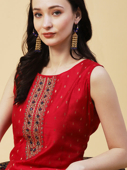 MRP (Inclusive of all taxes)Regular price ₹ 2,599.00₹ 2,599.00 Regular priceUnit price / per₹ 7,799.00Sale priceS M L XL 2XL 3XL add to cartSale{"id":6830673461334,"title":"Ethnic Woven \u0026 Hand Embroidered Kurta with Pant \u0026 Dupatta - Red","handle":"ethnic-woven-hand-embroidered-kurta-with-pant-dupatta-red","description":"\u003cp data-mce-fragment=\"1\"\u003e\u003cspan style=\"font-weight: 400;\" data-mce-fragment=\"1\" data-mce-style=\"font-weight: 400;\"\u003e\u003c\/span\u003e\u003cspan style=\"font-weight: 400;\" data-mce-fragment=\"1\" data-mce-style=\"font-weight: 400;\"\u003eStyle: Kurta - Flared, Bottom - Pant\u003c\/span\u003e\u003c\/p\u003e\n\u003cp data-mce-fragment=\"1\"\u003e\u003cspan style=\"font-weight: 400;\" data-mce-fragment=\"1\" data-mce-style=\"font-weight: 400;\"\u003eType: Party Wear\u003c\/span\u003e\u003c\/p\u003e\n\u003cp data-mce-fragment=\"1\"\u003e\u003cspan style=\"font-weight: 400;\" data-mce-fragment=\"1\" data-mce-style=\"font-weight: 400;\"\u003eNeckline: V-Shaped Neckline\u003c\/span\u003e\u003c\/p\u003e\n\u003cp data-mce-fragment=\"1\"\u003e\u003cspan style=\"font-weight: 400;\" data-mce-fragment=\"1\" data-mce-style=\"font-weight: 400;\"\u003eSleeve Pattern: Regular Sleeves\u003c\/span\u003e\u003c\/p\u003e\n\u003cp data-mce-fragment=\"1\"\u003e\u003cspan style=\"font-weight: 400;\" data-mce-fragment=\"1\" data-mce-style=\"font-weight: 400;\"\u003eSleeve Length: 3\/4th Sleeves\u003c\/span\u003e\u003c\/p\u003e\n\u003cp data-mce-fragment=\"1\"\u003e\u003cspan style=\"font-weight: 400;\" data-mce-fragment=\"1\" data-mce-style=\"font-weight: 400;\"\u003eProduct Details:\u003c\/span\u003e\u003c\/p\u003e\n\u003cul data-mce-fragment=\"1\"\u003e\n\u003cli data-mce-fragment=\"1\"\u003e\u003cspan style=\"font-weight: 400;\" data-mce-fragment=\"1\" data-mce-style=\"font-weight: 400;\"\u003e A-Line Flared Kurta\u003c\/span\u003e\u003c\/li\u003e\n\u003cli data-mce-fragment=\"1\"\u003e\u003cspan style=\"font-weight: 400;\" data-mce-fragment=\"1\" data-mce-style=\"font-weight: 400;\"\u003e Ethnic Woven all over\u003c\/span\u003e\u003c\/li\u003e\n\u003cli data-mce-fragment=\"1\"\u003e\u003cspan style=\"font-weight: 400;\" data-mce-fragment=\"1\" data-mce-style=\"font-weight: 400;\"\u003e Floral Embroidered Yoke\u003c\/span\u003e\u003c\/li\u003e\n\u003cli data-mce-fragment=\"1\"\u003e\u003cspan style=\"font-weight: 400;\" data-mce-fragment=\"1\" data-mce-style=\"font-weight: 400;\"\u003e Embellished with Sequin \u0026amp; Resham Detailing\u003c\/span\u003e\u003c\/li\u003e\n\u003cli data-mce-fragment=\"1\"\u003e\u003cspan style=\"font-weight: 400;\" data-mce-fragment=\"1\" data-mce-style=\"font-weight: 400;\"\u003e Crafted with French Knots Detailing\u003c\/span\u003e\u003c\/li\u003e\n\u003cli data-mce-fragment=\"1\"\u003e\u003cspan style=\"font-weight: 400;\" data-mce-fragment=\"1\" data-mce-style=\"font-weight: 400;\"\u003e Temple Gota Detailing\u003c\/span\u003e\u003c\/li\u003e\n\u003cli data-mce-fragment=\"1\"\u003e\u003cspan style=\"font-weight: 400;\" data-mce-fragment=\"1\" data-mce-style=\"font-weight: 400;\"\u003e Styled with Simple Silhouette\u003c\/span\u003e\u003c\/li\u003e\n\u003cli data-mce-fragment=\"1\"\u003e\u003cspan style=\"font-weight: 400;\" data-mce-fragment=\"1\" data-mce-style=\"font-weight: 400;\"\u003e Paired with Solid Pant \u003c\/span\u003e\u003c\/li\u003e\n\u003cli data-mce-fragment=\"1\"\u003e\u003cspan style=\"font-weight: 400;\" data-mce-fragment=\"1\" data-mce-style=\"font-weight: 400;\"\u003e Slip on Closure\u003c\/span\u003e\u003c\/li\u003e\n\u003cli data-mce-fragment=\"1\"\u003e\u003cspan style=\"font-weight: 400;\" data-mce-fragment=\"1\" data-mce-style=\"font-weight: 400;\"\u003e Partially Elasticated Waistline\u003c\/span\u003e\u003c\/li\u003e\n\u003cli data-mce-fragment=\"1\"\u003e\u003cspan style=\"font-weight: 400;\" data-mce-fragment=\"1\" data-mce-style=\"font-weight: 400;\"\u003e Comes with Solid Matching \u0026amp; Embroidered Dupatta\u003c\/span\u003e\u003c\/li\u003e\n\u003cli data-mce-fragment=\"1\"\u003e\u003cspan style=\"font-weight: 400;\" data-mce-fragment=\"1\" data-mce-style=\"font-weight: 400;\"\u003e Enhanced with Zari \u0026amp; Resham Work \u003c\/span\u003e\u003c\/li\u003e\n\u003c\/ul\u003e\n\u003cp data-mce-fragment=\"1\"\u003e\u003cspan style=\"font-weight: 400;\" data-mce-fragment=\"1\" data-mce-style=\"font-weight: 400;\"\u003eModel’s Height: 5’7” ft. Size: Wearing Size S.\u003c\/span\u003e\u003c\/p\u003e\n\u003ch1 data-mce-fragment=\"1\"\u003e\u003cspan style=\"font-weight: 400;\" data-mce-fragment=\"1\" data-mce-style=\"font-weight: 400;\"\u003eFabric Details\u003c\/span\u003e\u003c\/h1\u003e\n\u003cp data-mce-fragment=\"1\"\u003e\u003cspan style=\"font-weight: 400;\" data-mce-fragment=\"1\" data-mce-style=\"font-weight: 400;\"\u003eColour: Kurta - Red, Bottom - Red, Dupatta - Red \u003c\/span\u003e\u003c\/p\u003e\n\u003cp data-mce-fragment=\"1\"\u003e\u003cspan style=\"font-weight: 400;\" data-mce-fragment=\"1\" data-mce-style=\"font-weight: 400;\"\u003eFabric: Kurta - Cotton Chanderi , Bottom - Cotton, Dupatta - Chiffon \u003c\/span\u003e\u003c\/p\u003e\n\u003cp data-mce-fragment=\"1\"\u003e\u003cspan style=\"font-weight: 400;\" data-mce-fragment=\"1\" data-mce-style=\"font-weight: 400;\"\u003eWash Care: Dry Clean\u003c\/span\u003e\u003c\/p\u003e\n\u003ch1\u003eGarment Measurements\u003c\/h1\u003e\n\u003cp\u003e\u003cstrong\u003eMeasurement (in inches) \u003c\/strong\u003e\u003c\/p\u003e\n\u003cp\u003eLength – 49, Sleeves – 17,\u003c\/p\u003e\n\u003cp\u003eBottom - 37\u003c\/p\u003e\n\u003ch1 data-mce-fragment=\"1\"\u003e\u003cspan data-mce-fragment=\"1\"\u003eProduct Information\u003c\/span\u003e\u003c\/h1\u003e\n\u003cp data-mce-fragment=\"1\"\u003e\u003cspan data-mce-fragment=\"1\"\u003e\u003cstrong\u003eManufactured\/Packed\/Marketed By:\u003c\/strong\u003e\u003cbr\u003e\u003c\/span\u003e\u003cspan data-mce-fragment=\"1\"\u003eFashor Lifestyle Pvt. Ltd.\u003cbr\u003e28\/30, 