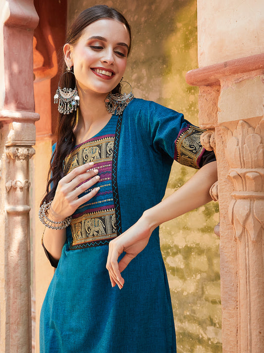 MRP (Inclusive of all taxes)Regular price ₹ 1,389.00₹ 1,389.00 Regular priceUnit price / per₹ 3,499.00Sale priceS M L XL 2XL 3XL 4XL 5XL 6XL add to cartSale{"id":6870391128150,"title":"Solid Ethnic Woven Straight Fit Kurta with Pant - Blue","handle":"solid-ethnic-woven-straight-fit-kurta-with-pant-blue","description":"\u003ch1\u003eHighlights\u003c\/h1\u003e\n- Straight Fit Kurta\u003cbr data-mce-fragment=\"1\"\u003e- Ethnic Woven at Front\u003cbr data-mce-fragment=\"1\"\u003e- Embellished with Sequin Work\u003cbr data-mce-fragment=\"1\"\u003e\u003cbr data-mce-fragment=\"1\"\u003e\n\u003ch1\u003eFabric \u0026amp; Colour\u003c\/h1\u003e\nTop Colour: Blue\u003cbr data-mce-fragment=\"1\"\u003eTop Fabric: Cotton Blend\u003cbr data-mce-fragment=\"1\"\u003eBottom Colour: Blue\u003cbr data-mce-fragment=\"1\"\u003eBottom Fabric: Cotton Blend\u003cbr data-mce-fragment=\"1\"\u003e\n\u003ch1\u003eSpecifications\u003c\/h1\u003e\nTop Design: Solid\u003cbr data-mce-fragment=\"1\"\u003eTop Craft: Plain and Prints\u003cbr data-mce-fragment=\"1\"\u003eTop Shape: Straight\u003cbr data-mce-fragment=\"1\"\u003eNeck: Round Neck\u003cbr data-mce-fragment=\"1\"\u003eSleeve Length: Three-Quarter Sleeves\u003cbr data-mce-fragment=\"1\"\u003eTop Length: Knee Length\u003cbr data-mce-fragment=\"1\"\u003eHemline: Straight\u003cbr data-mce-fragment=\"1\"\u003eSlit: Side Slits\u003cbr data-mce-fragment=\"1\"\u003e\u003cbr data-mce-fragment=\"1\"\u003eBottom Type: Trousers\u003cbr data-mce-fragment=\"1\"\u003eBottom Closure: Drawstring\u003cbr data-mce-fragment=\"1\"\u003eWaistband: Partially Elasticated\u003cbr data-mce-fragment=\"1\"\u003e\u003cbr data-mce-fragment=\"1\"\u003eWash Care: Machine Wash\u003cbr data-mce-fragment=\"1\"\u003e\u003cbr data-mce-fragment=\"1\"\u003eMeasurement (in inches)\u003cbr data-mce-fragment=\"1\"\u003eLength – 44, Sleeves – 14,\u003cbr data-mce-fragment=\"1\"\u003eBottom - 38\u003cbr data-mce-fragment=\"1\"\u003e\u003cbr data-mce-fragment=\"1\"\u003eModel’s Height: 5’7”. Wearing Size S.\u003cbr data-mce-fragment=\"1\"\u003e\n\u003ch1\u003eProduct Information\u003c\/h1\u003e\nManufactured\/Packed\/Marketed By:\u003cbr data-mce-fragment=\"1\"\u003eFashor Lifestyle Pvt. Ltd.\u003cbr data-mce-fragment=\"1\"\u003e28\/30, Sudarshanpura Industrial Area,\u003cbr data-mce-fragment=\"1\"\u003eJaipur - 302006.\u003cbr data-mce-fragment=\"1\"\u003eCountry of Origin: India","published_at":"2023-10-06T09:38:14+05:30","created_at":"2023-07-07T15:06:53+05:30","vendor":"Fashor","type":"2P Kurta Set","tags":["1001-2000","16676","2XL","All Styles","bogo-zone","bs","casualwear","colour_blue","cotton-blend","discount-zone","ks","KURTI","kurtis","MAVERICK","meta-size-chart-","monsoo","offer-zone","plain-and-prints","plusbogo","S","Sets under 2999","solid","straight","workwear"],"price":138900,"price_min":138900,"price_max":138900,"available":true,"price_varies":false,"compare_at_price":349900,"compare_at_price_min":349900,"compare_at_price_max":349900,"compare_at_price_varies":false,"variants":[{"id":40302824194134,"title":"S","option1":"S","option2":null,"option3":null,"sku":"36-KB016676E3FS","requires_shipping":true,"taxable":false,"featured_image":{"id":31604695040086,"product_id":6870391128150,"position":1,"created_at":"2023-09-23T11:13:11+05:30","updated_at":"2023-09-23T11:13:13+05:30","alt":null,"width":1080,"height":1440,"src":"\/\/fashor.com\/cdn\/shop\/files\/22735_1.jpg?v=1695447793","variant_ids":[40255908642902,40255908675670,40255908708438,40255908741206,40255908773974,40302824194134,40506558152790,40506558185558,40506558218326]},"available":true,"name":"Solid Ethnic Woven Straight Fit Kurta with Pant - Blue - S","public_title":"S","options":["S"],"price":138900,"weight":0,"compare_at_price":349900,"inventory_quantity":1,"inventory_management":"shopify","inventory_policy":"deny","barcode":null,"featured_media":{"alt":null,"id":24318697996374,"position":1,"preview_image":{"aspect_ratio":0.75,"height":1440,"width":1080,"src":"\/\/fashor.com\/cdn\/shop\/files\/22735_1.jpg?v=1695447793"}},"requires_selling_plan":false,"selling_plan_allocations":[],"quantity_rule":{"min":1,"max":null,"increment":1}},{"id":40255908642902,"title":"M","option1":"M","option2":null,"option3":null,"sku":"38-KB016676E3FS","requires_shipping":true,"taxable":false,"featured_image":{"id":31604695040086,"product_id":6870391128150,"position":1,"created_at":"2023-09-23T11:13:11+05:30","updated_at":"2023-09-23T11:13:13+05:30","alt":null,"width":1080,"height":1440,"src":"\/\/fashor.com\/cdn\/shop\/files\/22735_1.jpg?v=1695447793","variant_ids":[40255908642902,40255908675670,40255908708438,40255908741206,40255908773974,40302824194134,40506558152790,40506558185558,40506558218326]},"available":false,"name":"Solid Ethnic Woven Straight Fit Kurta with Pant - Blue - M","public_title":"M","options":["M"],"price":138900,"weight":0,"compare_at_price":349900,"inventory_quantity":0,"inventory_management":"shopify","inventory_policy":"deny","barcode":null,"featured_media":{"alt":null,"id":24318697996374,"position":1,"preview_image":{"aspect_ratio":0.75,"height":1440,"width":1080,"src":"\/\/fashor.com\/cdn\/shop\/files\/22735_1.jpg?v=1695447793"}},"requires_selling_plan":false,"selling_plan_allocations":[],"quantity_rule":{"min":1,"max":null,"increment":1}},{"id":40255908675670,"title":"L","option1":"L","option2":null,"option3":null,"sku":"40-KB016676E3FS","requires_shipping":true,"taxable":false,"featured_image":{"id":31604695040086,"product_id":6870391128150,"position":1,"created_at":"2023-09-23T11:13:11+05:30","updated_at":"2023-09-23T11:13:13+05:30","alt":null,"width":1080,"height":1440,"src":"\/\/fashor.com\/cdn\/shop\/files\/22735_1.jpg?v=1695447793","variant_ids":[40255908642902,40255908675670,40255908708438,40255908741206,40255908773974,40302824194134,40506558152790,40506558185558,40506558218326]},"available":false,"name":"Solid Ethnic Woven Straight Fit Kurta with Pant - Blue - L","public_title":"L","options":["L"],"pr